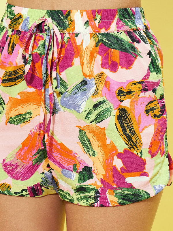 Berrylush Women Pink & Multicolour Abstract Printed High-Rise Elastic Waist Tie-Up Slip-On Mini Summer Shorts
