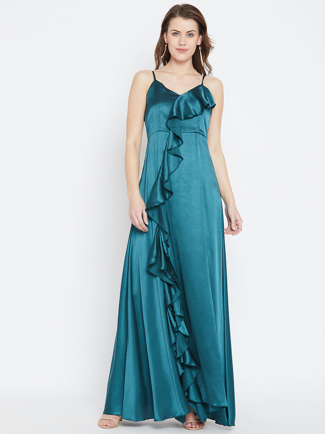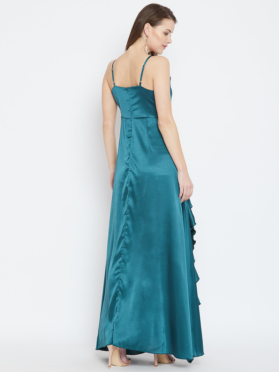Berrylush Women Solid Teal Blue V-Neck Satin Thigh-High Slit Ruffled Maxi Dress
