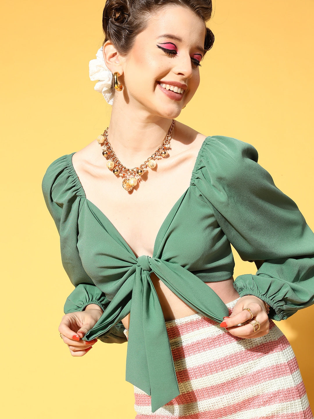 Berrylush Women Solid Sage Green Sweetheart Neck Front Tie-Up Crepe Cropped Top