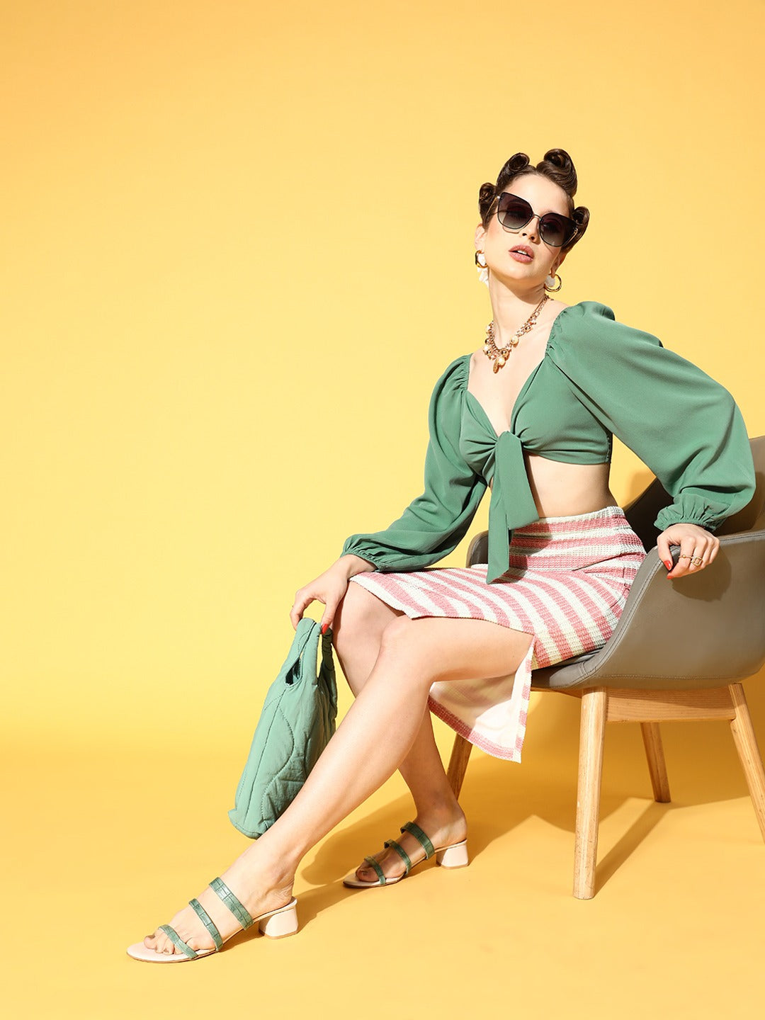 Immense yourself in the boho-chic and voguish style by donning this stunning Solid Sage Green Sweetheart Neck Front Tie-Up Crepe Cropped Top from Berrylush. This top gives an instant uplift to your casual look as it is designed with a sweetheart neck that gives a heart shape outline to your neckline with a hint of loveliness. Featuring long-puff sleeves that lend your arms a charismatic coverage to keep them warm and protected from sunburn issues. Also, the woven detailing of this top improves the overall structure and durability of this top while maintaining its smart appeal. You can team up this wrap crop top with a high-waisted A-line skirt, tantalizing jewellery, a pair of stylish wedges, and a white handbag to create a charming look.