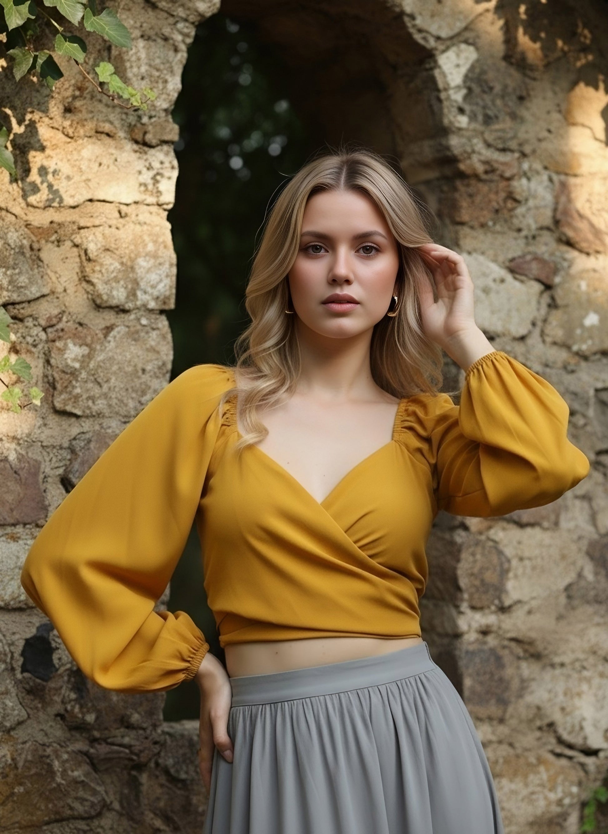 Create the perfect mood with eye-catching style and colours that goes well-acquainted with every moment of life by opting for this captivating Solid Mustard Yellow Sweetheart Neck Front Tie-Up Crepe Cropped Top from Berrylush. You will surely find this top cute yet sexy as it comes in crop length that gives an eccentric appeal to your attractive figure with enticing exposure. Presenting long-puff sleeves that make this top appropriate for every season and weather condition by lending your arms proper coverage with a volumized style. That's not all, this top comes with woven detailing that enhances the overall structural integrity of this top with a smart sheen. Fashion up this wrap crop top with high-waist trousers, fun tassel earrings, and a colour-block style handbag to create an enchanting look.