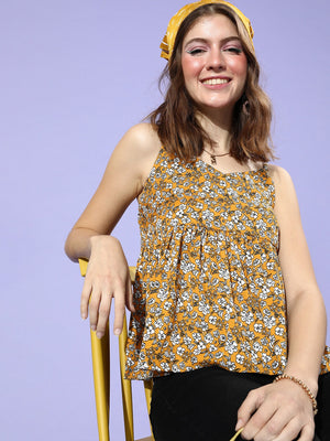 An amazing look is easily achievable with this Mustard Yellow Floral Printed Crepe Peplum Top from Berrylush. A stunning floral top that fills your aura with the jovial spark and the sleeveless design makes your entire wearing experience to be an airy & ventilated one. The sleek strap design will make your shoulder line appear wider with an illusion. The pleated detailing gives your torso a solid bounce and all your moves will carry a flirty aura. The mustard yellow colour puts your layout to be an exotic one. The crepe polyester fabric will keep your top to stay creaseless for hours. Match this exotic peplum top with mid-rise jeans and a pair of stilettos for a gorgeous appeal. Bring opulence to your casual wear with this peplum top with Berrylush.