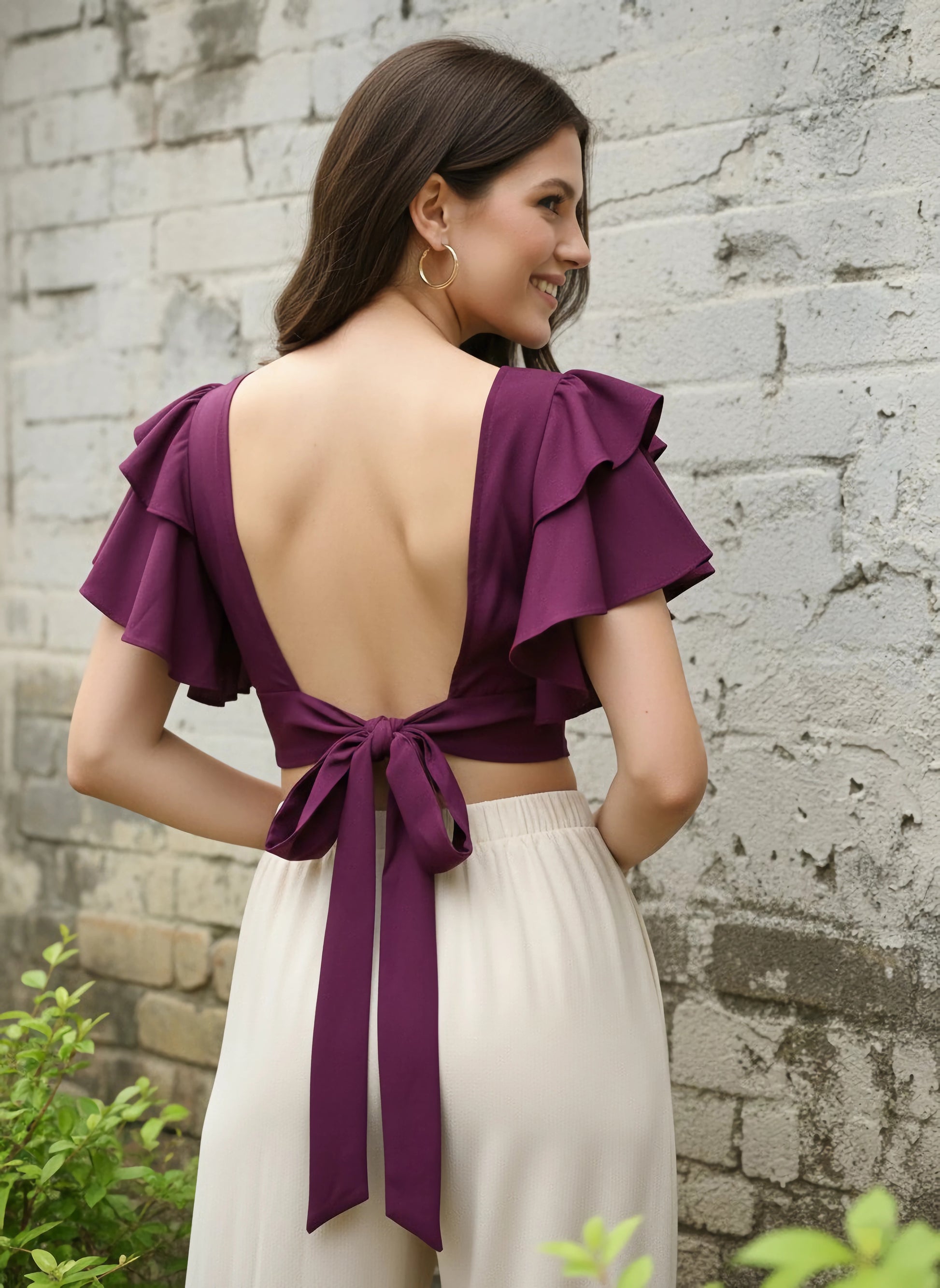 Present a royal aura with this Solid Purple Flutter Sleeves Blouson Crop Top from Berrylush. The flutter sleeves fill your arms with a dramatic punch and the solid purple colour enhances the royal feature of your layout. The round neckline flaunts your torso with a voluptuous outline to your front. The fitted silhouette will flaunt your curves exclusively and the banded chest line with the blouson design will enhance the feminine charm. The back appears exquisite with the tie-up closure that also takes your style to a classy vintage affair. Rock the party floor with this Berrylush blouson crop top by matching it with high rise flared pants and ankle boots.