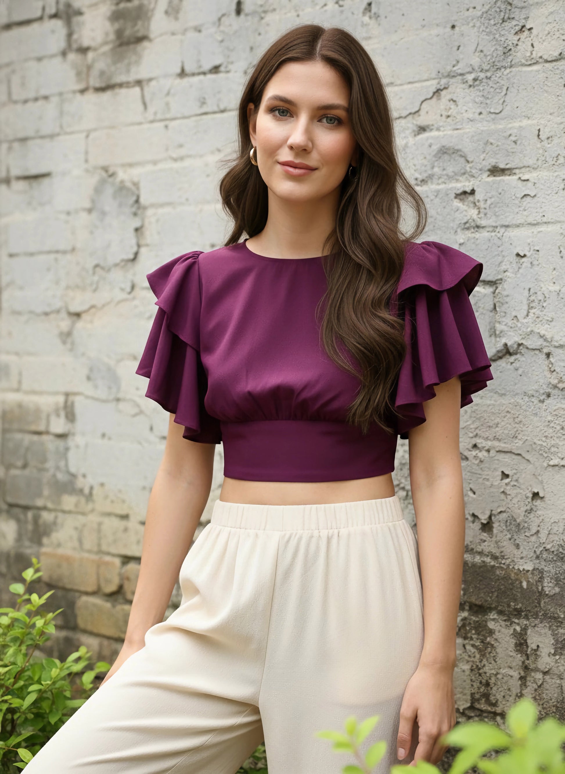 Berrylush Women Solid Purple Flutter Sleeves Blouson Crop Top