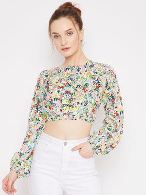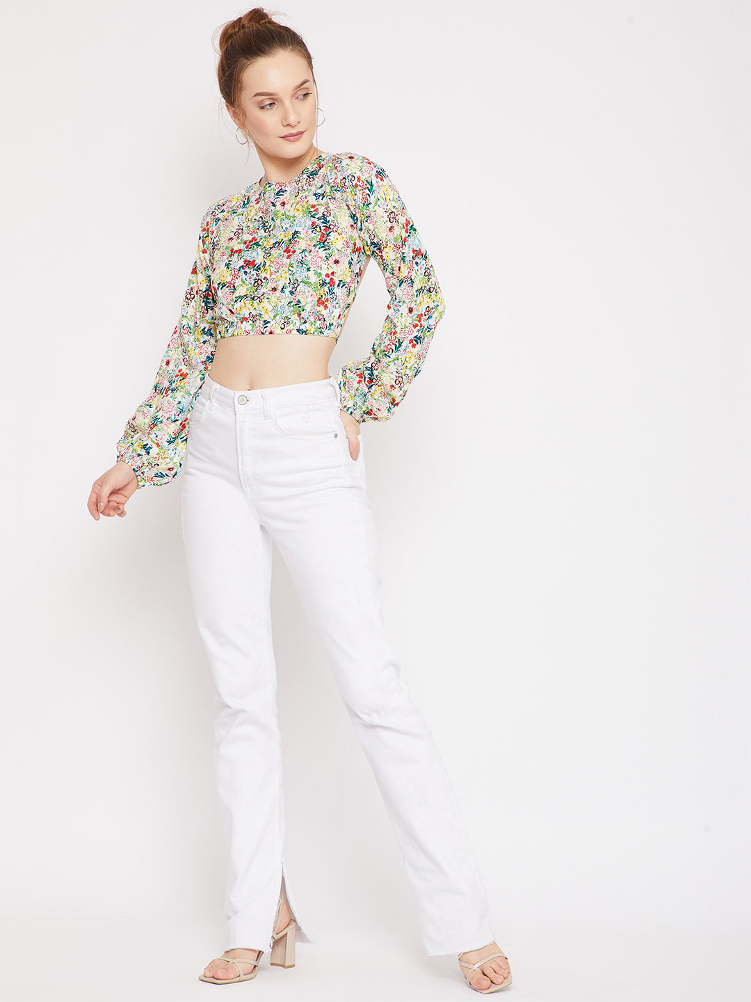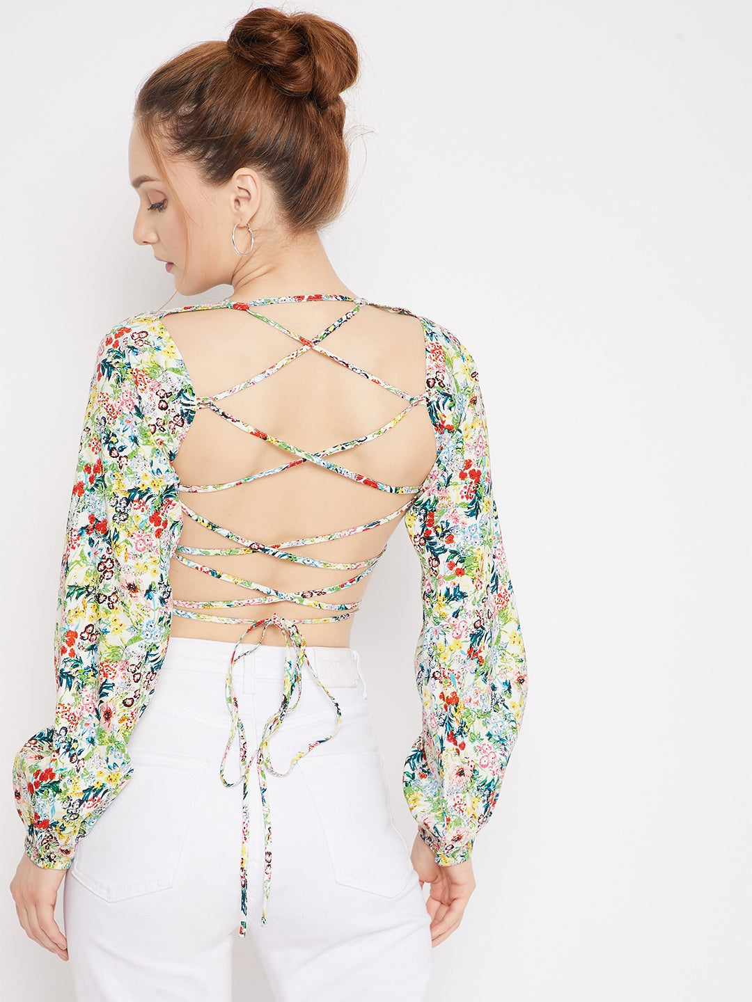 Introduce enchanting and eye-catching aesthetics into your casual wardrobe with this fashionable White & Multicolour Floral Printed Round Neck Criss-Cross Tie-Up Back Crop Top from Berrylush. This top is mostly loved for its Criss cross tie-back style which gives a sexy appeal to your beautiful back. Imbued with charming allover multicoloured floral print for a hint of modernity and trendy appearance while the cropped length lends an enticing exposure to your natural curves. Wear this attractive crop top with fitted denim jeans, a pair of high-heels, and a cute side bag to get a fashion-focused look.