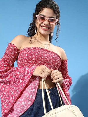 Berrylush Women Pink Floral Printed Off-Shoulder Crepe Bardot Crop Top