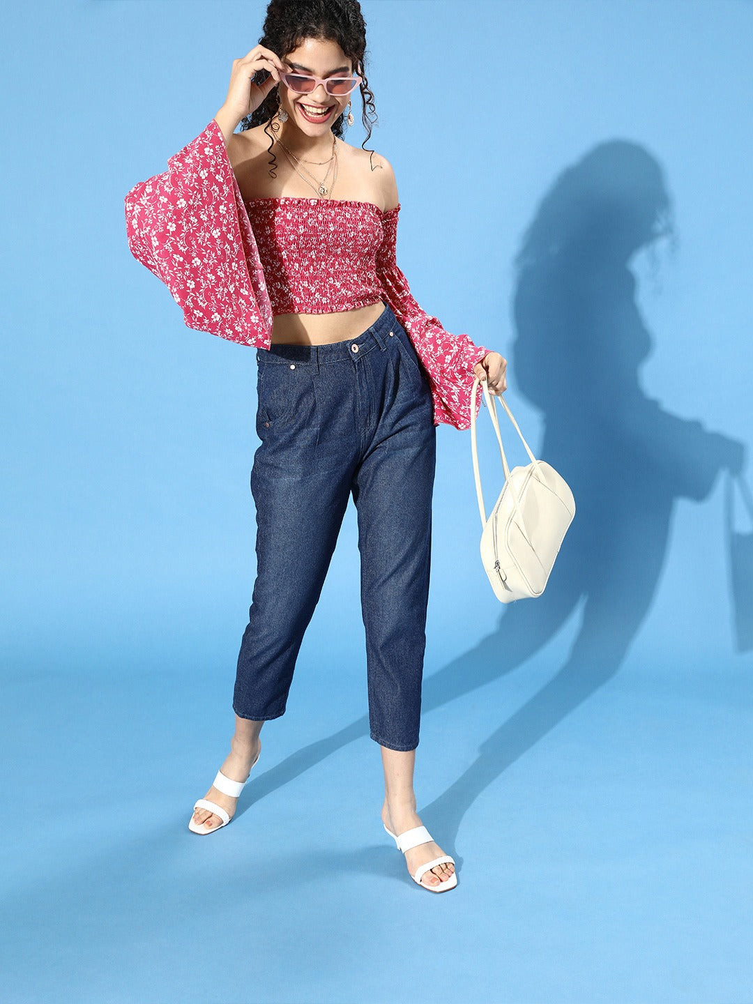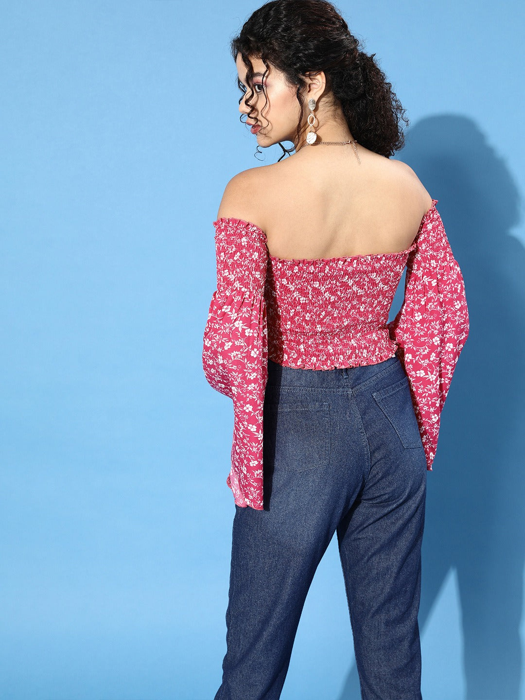 Enhance your casual wear collection this spring season by escorting yourself with this Pink Floral Printed Off-Shoulder Crepe Bardot Crop Top from Berrylush. Designed with an off-the-shoulder neck design to disclose and outshine your beautiful neckline delicately. The long bell sleeves of the top get your arm an attractive appeal with proper coverage to avoid sunburn on summer days. Smocking surface styling gives a flashy standout to your casual look and the Bardot styling of the top gets you a flattering and super chic look. The cropped length provides exposure to your waist and further appear you look exotic. Partner this alluring top with denim jeans and your favourite side bag to get a stunning look.