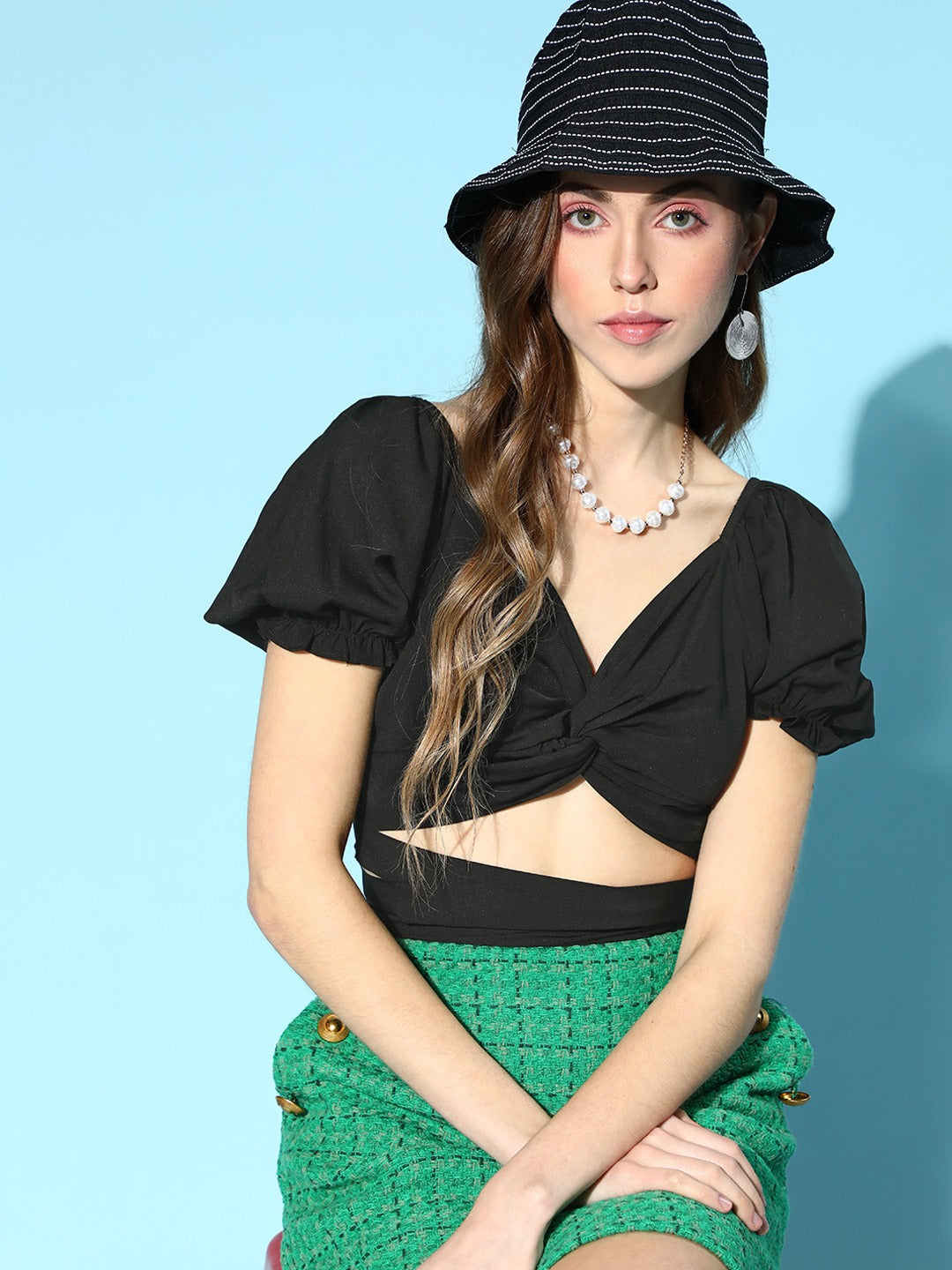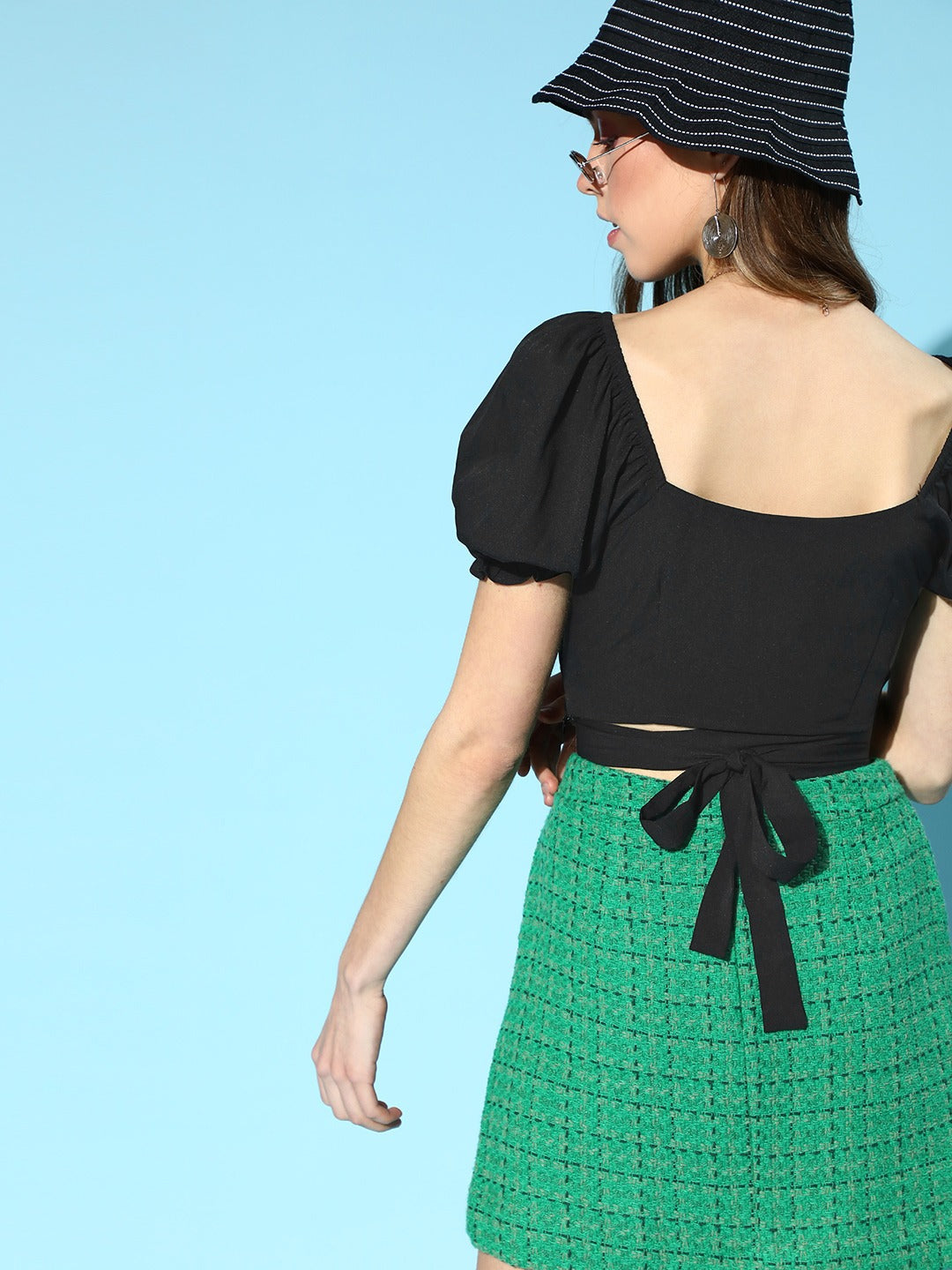 Berrylush Women Solid Black Sweetheart Neck Front Twist Waist Tie-Up Crepe Wrap Crop Top