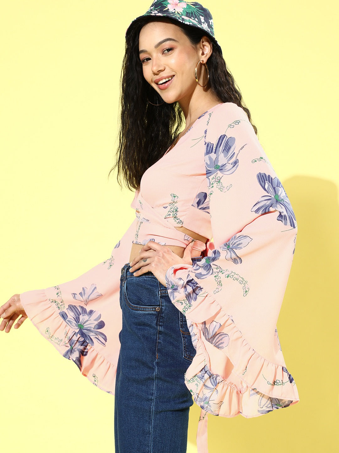 Leave your unique style impression wherever you go with the addition of this admirable Peach & Navy Blue Floral Printed V-Neck Waist Tie-Up Wrap Crop Top from Berrylush to your capsule closet. The most astonishing element of this top is the waist tie-up surface styling that creates an illustration of a cute bow attached to your waist. Designed with long bell sleeves that lend an attractive coverage to your arms while keeping them warm and protected from suntan. You can match this pretty pink floral crop top with a pair of denim jeans, caged heels, and a sling bag to create a fascinating look.