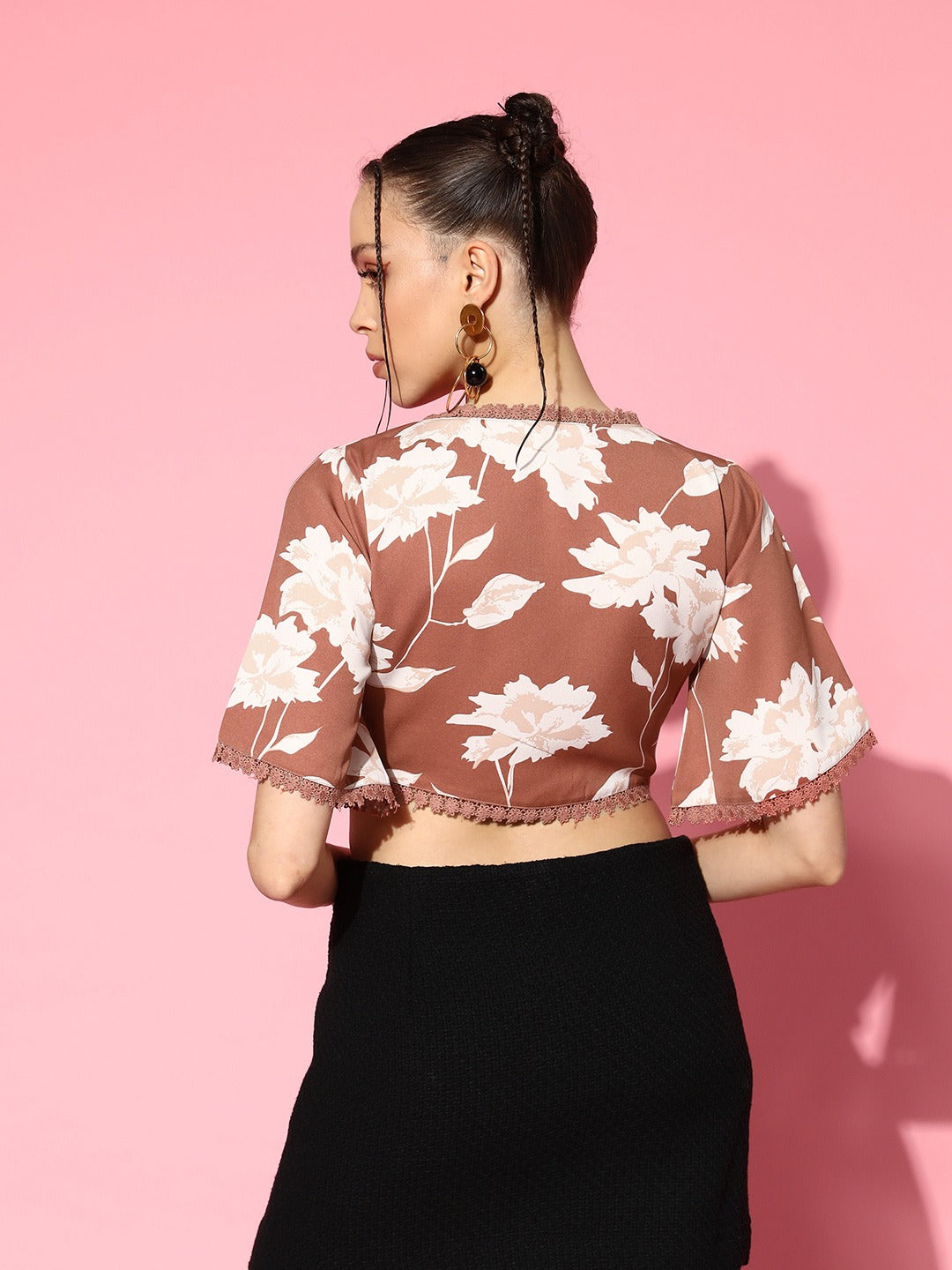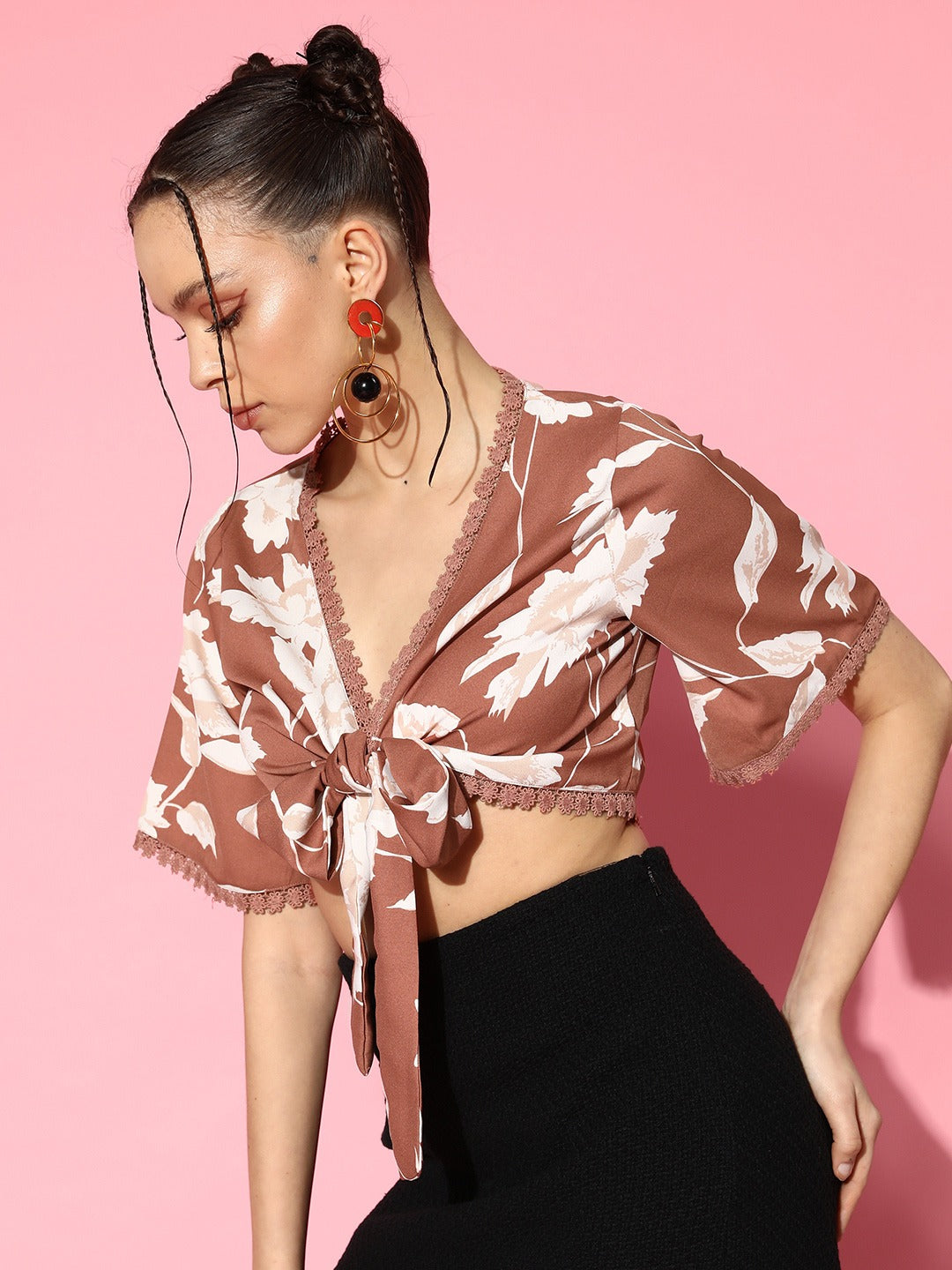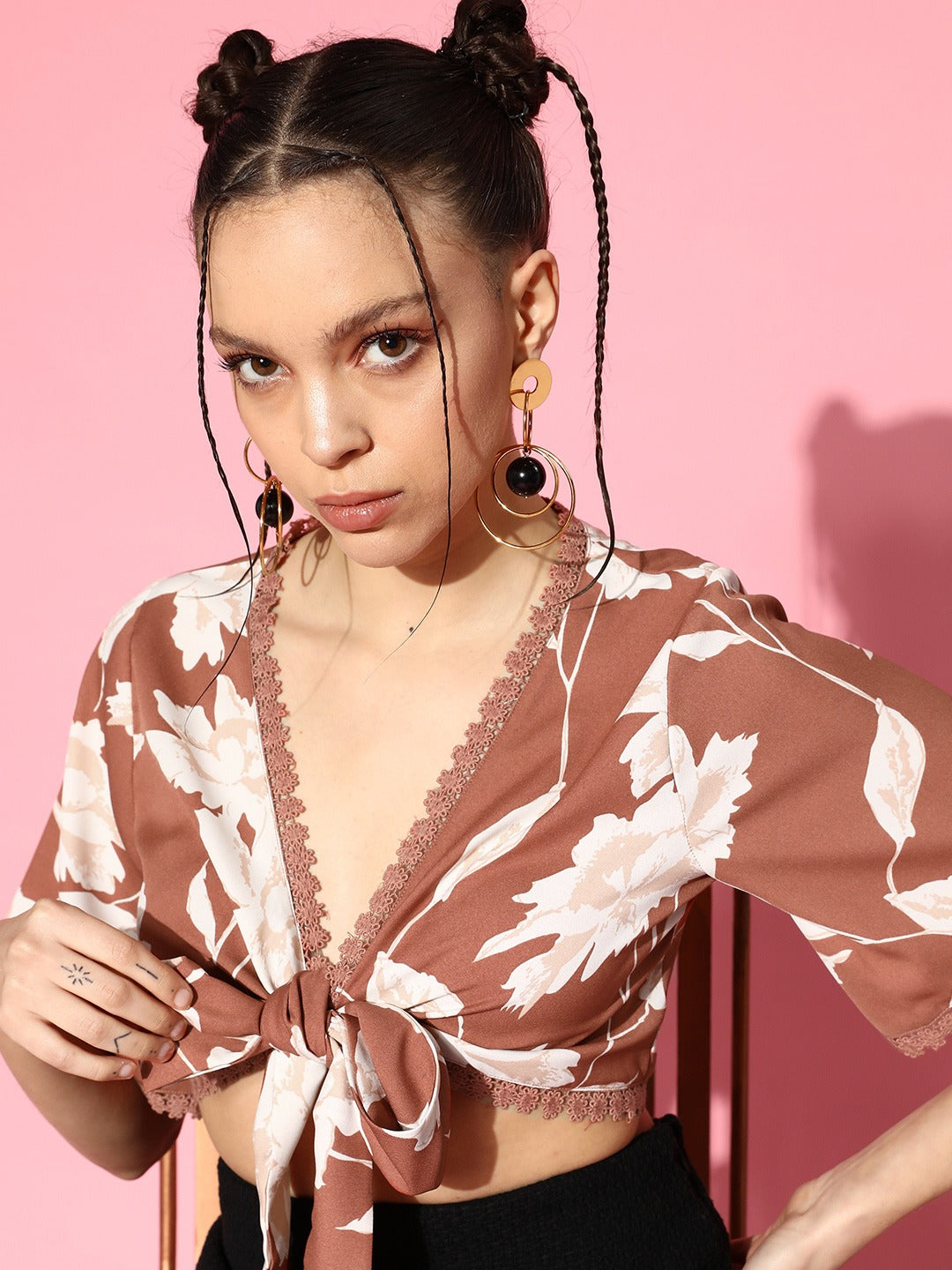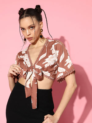 Berrylush Women Brown & White Floral Printed V-Neck Lace Waist Tie-Up Crepe Cropped Top