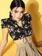Lend your outdoor edit a boho-chic and voguish touch by opting for this charming Black & Beige Floral Printed V-Neck Lace-Up Front Fitted Crop Top from Berrylush. Fashioned with a cropped length that offers this top a trendy style essence while showing off your astonishing feminine figure. Flaunting an amazing amalgam of black shade with a beige floral print that depicts your bold and strong personality with a hint of nature's beauty and neutrality traits. Designed with short-puff sleeves to give your gorgeous arms an appropriate exposure that keeps them cool and comfy. Complete your look flawlessly by partnering up this crop top with a high-waist brown skirt, a pair of caged heels, triangular sunglasses, and a black side bag.