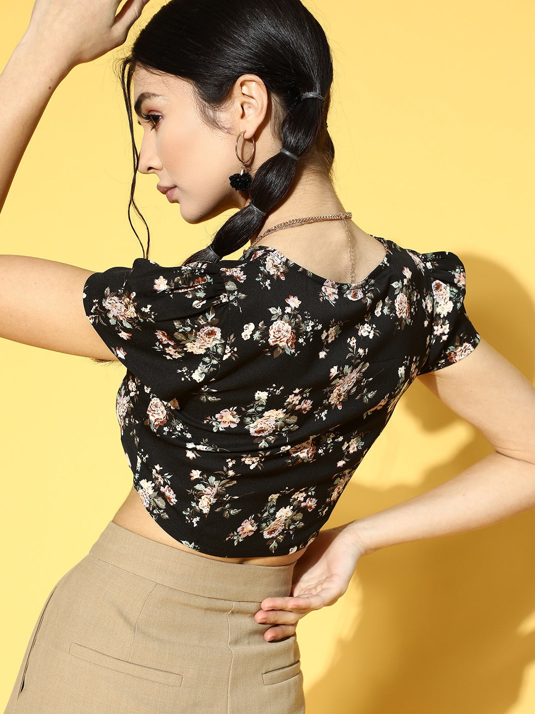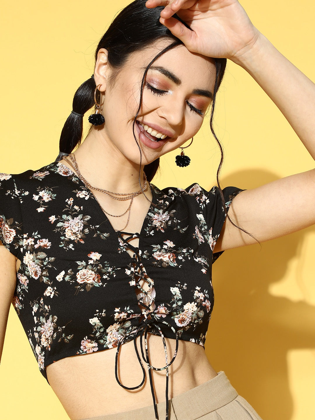 Berrylush Women Black & Beige Floral Printed V-Neck Lace-Up Front Fitted Crop Top
