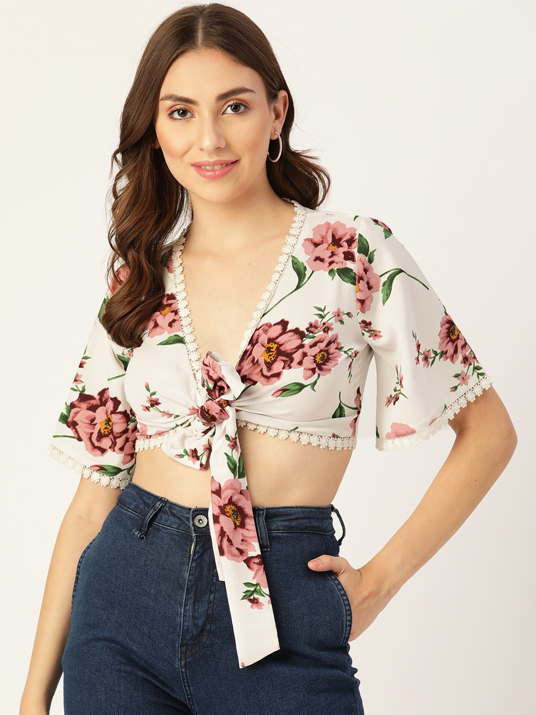 Berrylush Women White & Pink Floral Printed Tie Front Lace Trim Crop Top