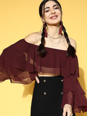 Berrylush Women Solid Maroon Dobby Weave Off-Shoulder Neck Semi-Sheer Layered Bardot Crop Top
