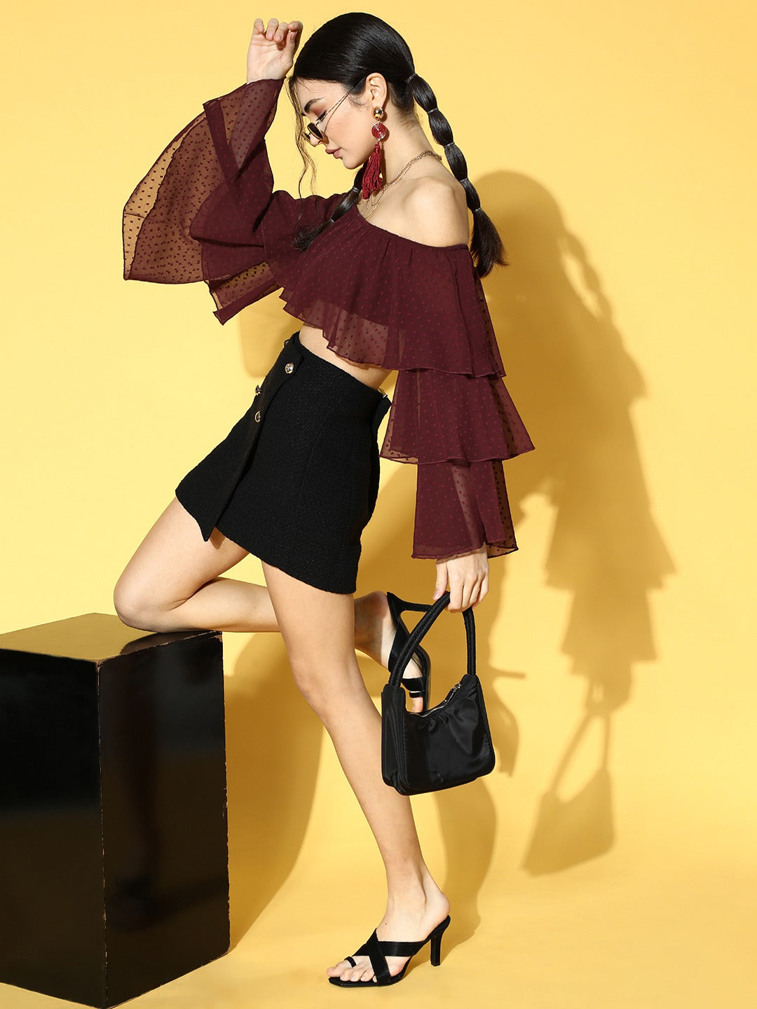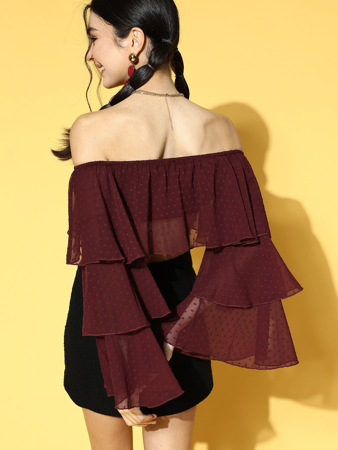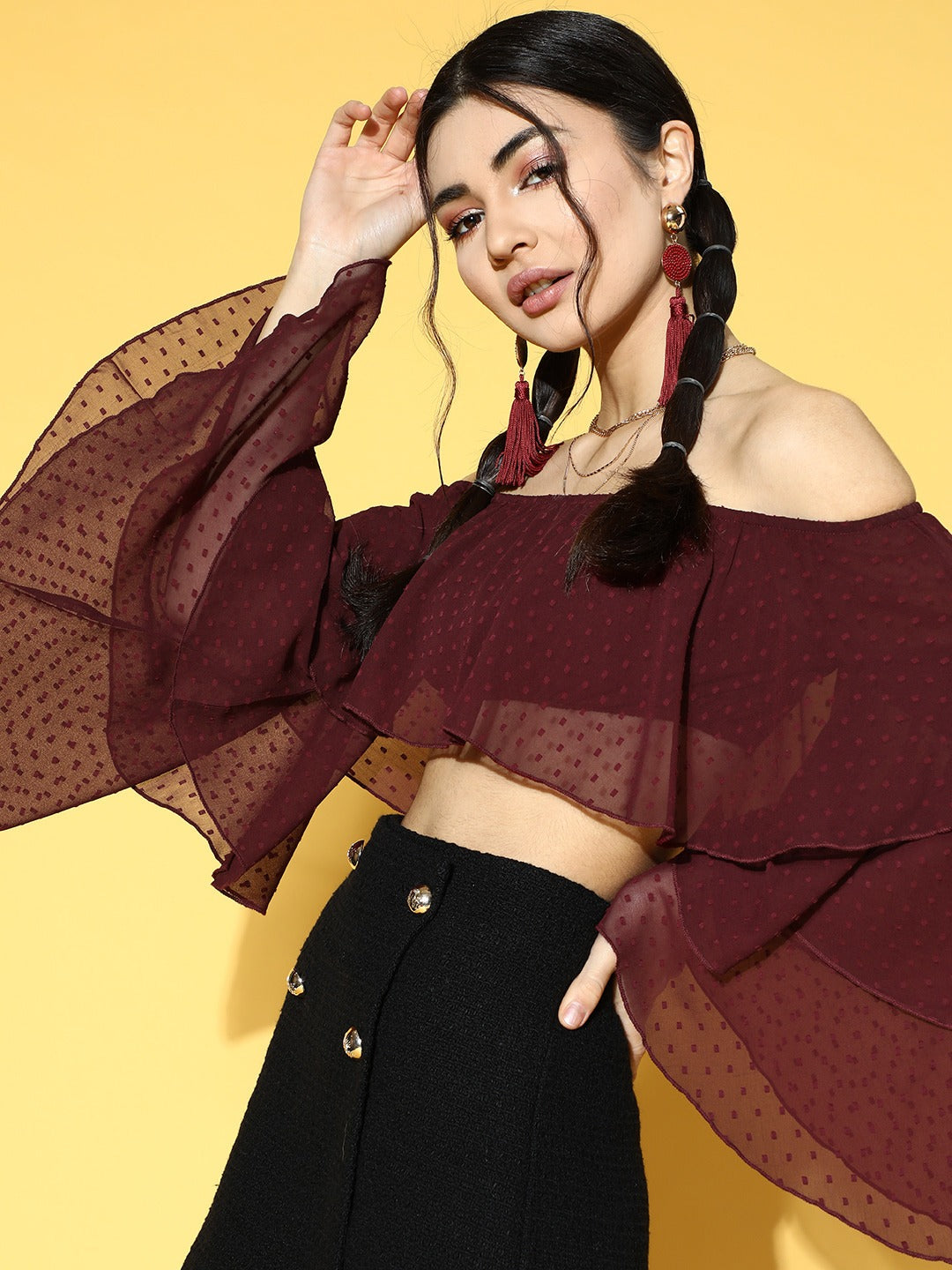 Style is all about astonishing silhouettes, and statement-making design just like this Solid Maroon Dobby Weave Off-Shoulder Neck Semi-Sheer Layered Bardot Crop Top from Berrylush. Tailored in crop length to make this top upgraded with the latest trend and elegantly show off your feminine figure that grabs all the attention towards you. Fashioned with long-bell sleeves to lend your arms a decorative coverage that protects your arms from harmful UV rays. Presenting semi-sheer transparency removes minor glare to this top while diffusing more light with little privacy. Keep your casual look classy by teaming up this bardot top with a black mini skirt, red teardrop earrings, a pair of black high-heels, and a fashionable black handbag.