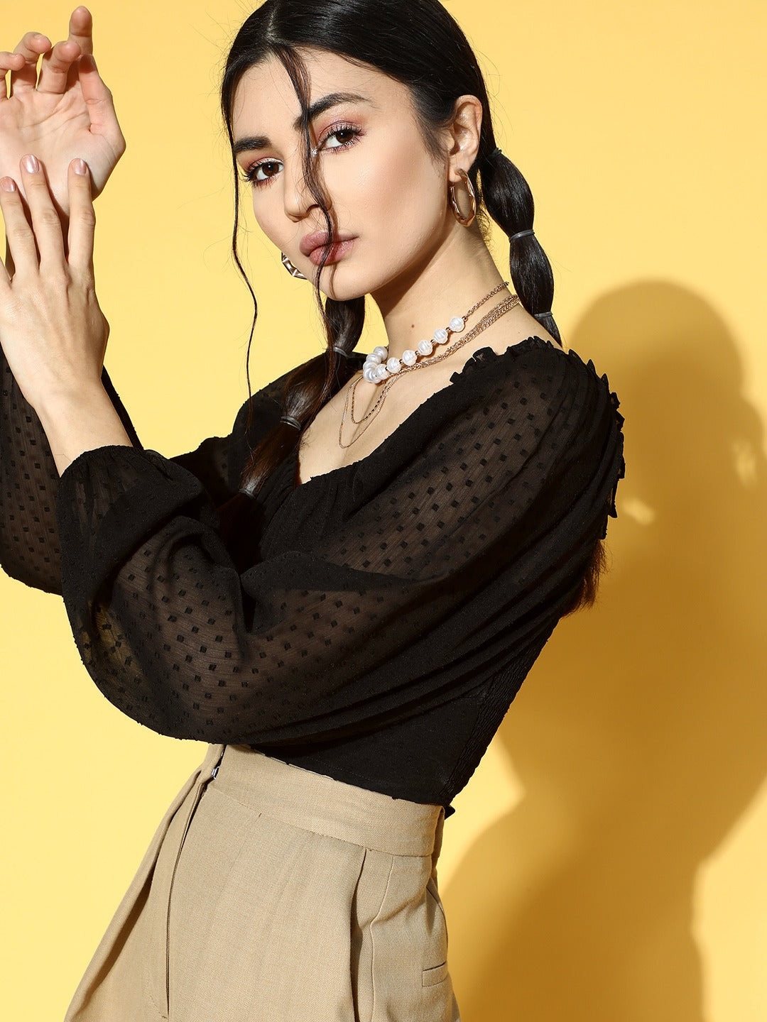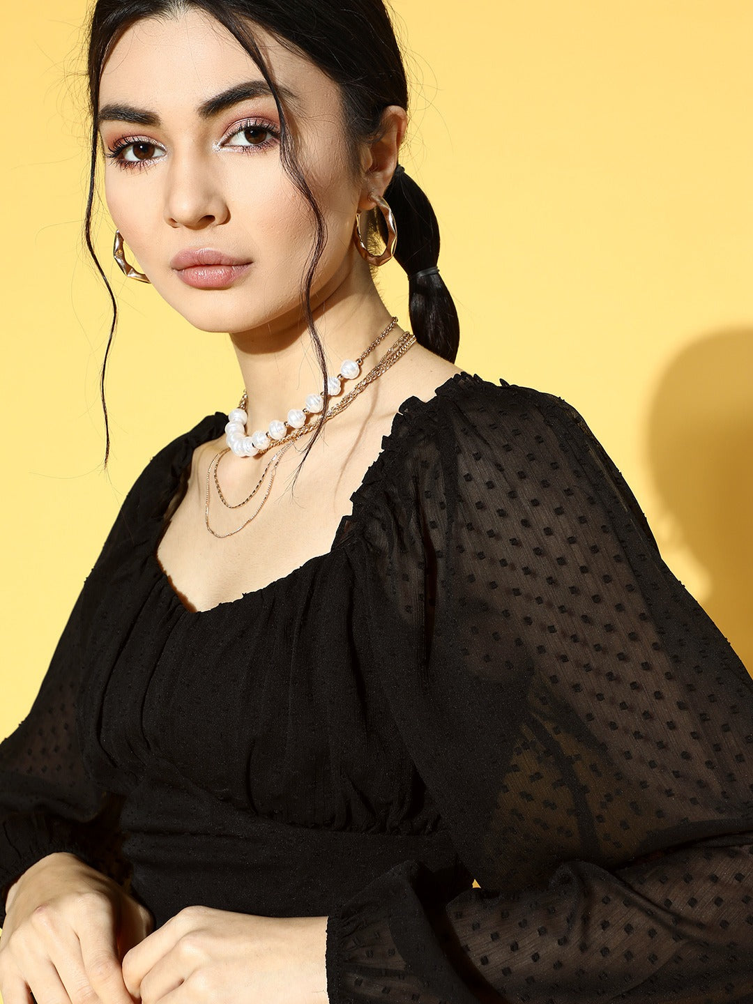 Berrylush Women Solid Black Dobby Weave Sweetheart Neck Puff Sleeve Crepe Smocked Crop Top