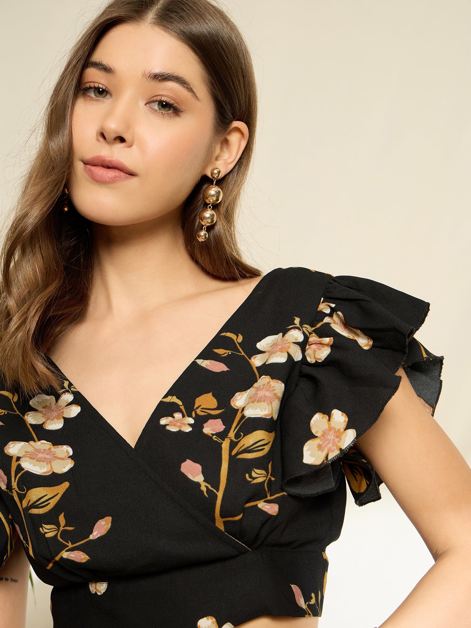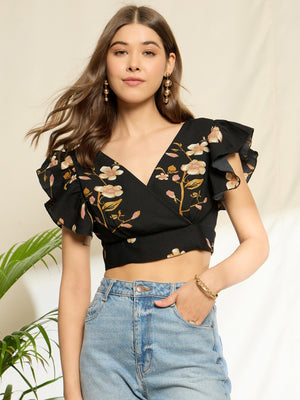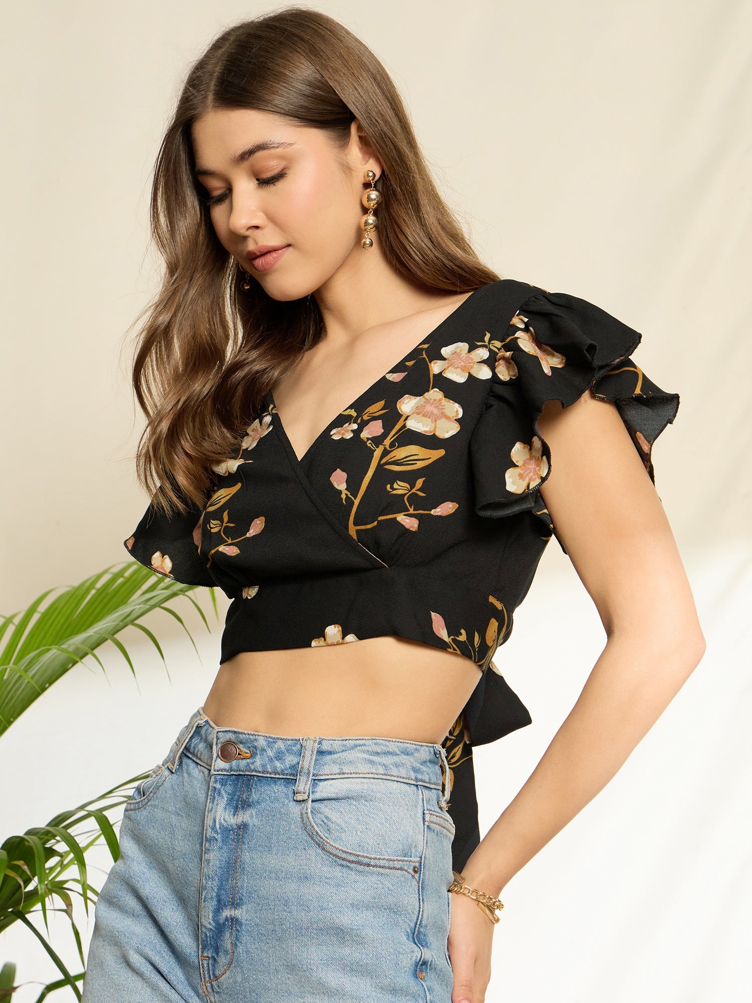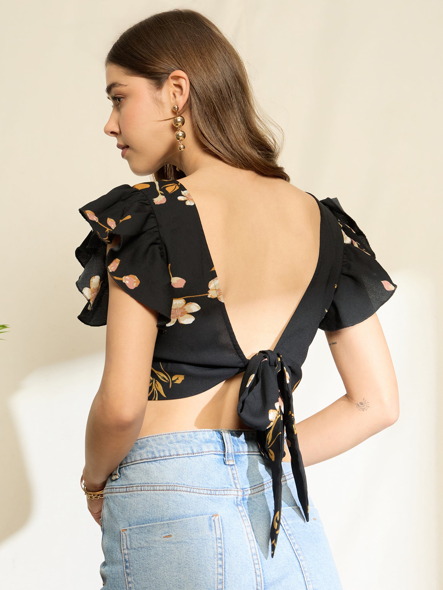 Berrylush Women Black Floral Printed V-Neck Cap Sleeves Backless Tie-Up Ruffled Crop Top