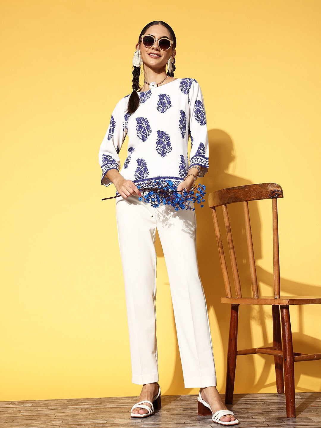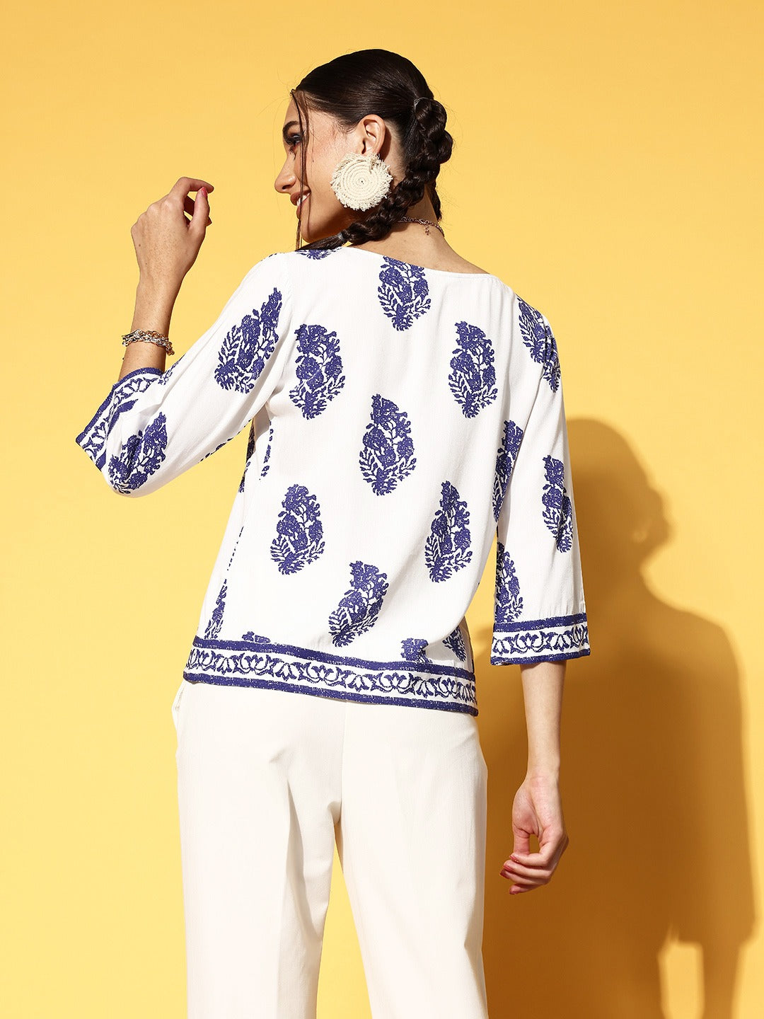 Berrylush Women White & Blue Paisley Printed Boat Neck Three-Quarter Sleeve Cotton Woven Regular Top