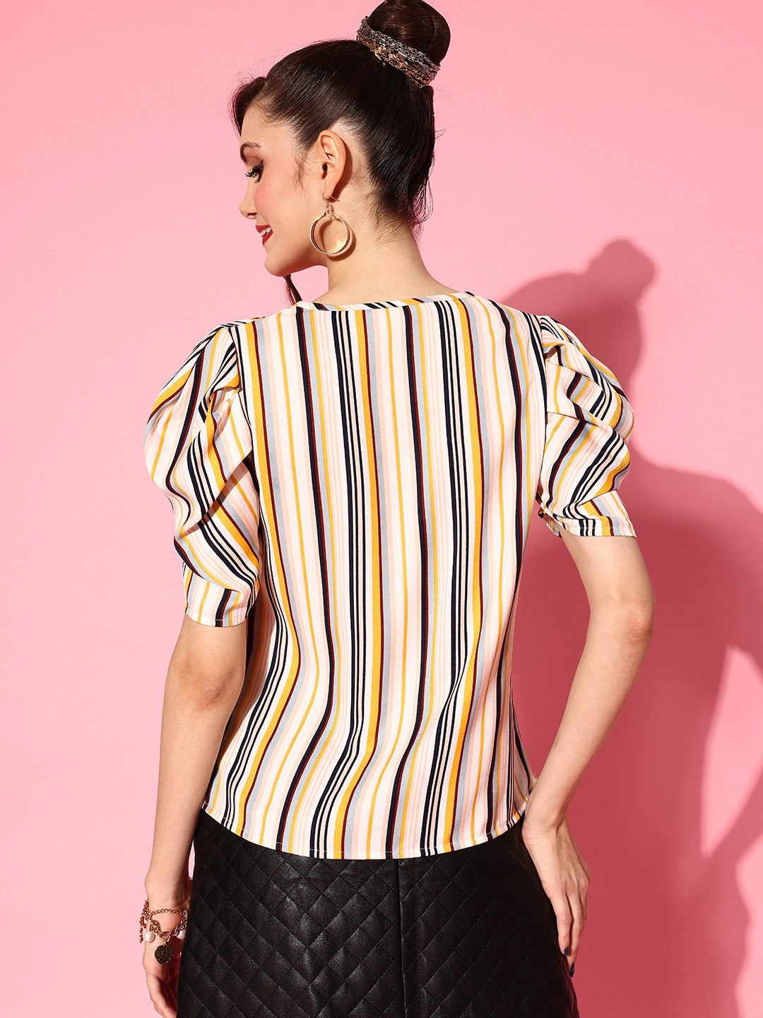 Bring a sophisticated charm to get a desk dinner ensemble with this pretty Pink & Mustard Yellow Striped Pattern Collar Neck Crepe Shirt Top from Berrylush. Showcasing beautiful pink and mustard yellow shades to give away a classy vibe with a stunning appearance. Spun from lightweight crepe polyester fabric to provide quick drying and moisture-wicking properties to this top. Designed with short puffed sleeves gives a dramatic essence and flowy structure to your arms. Pair this boho-chic regular top with a stylish mini skirt, hoop earrings, and a fabulous side bag to get an attractive look.
