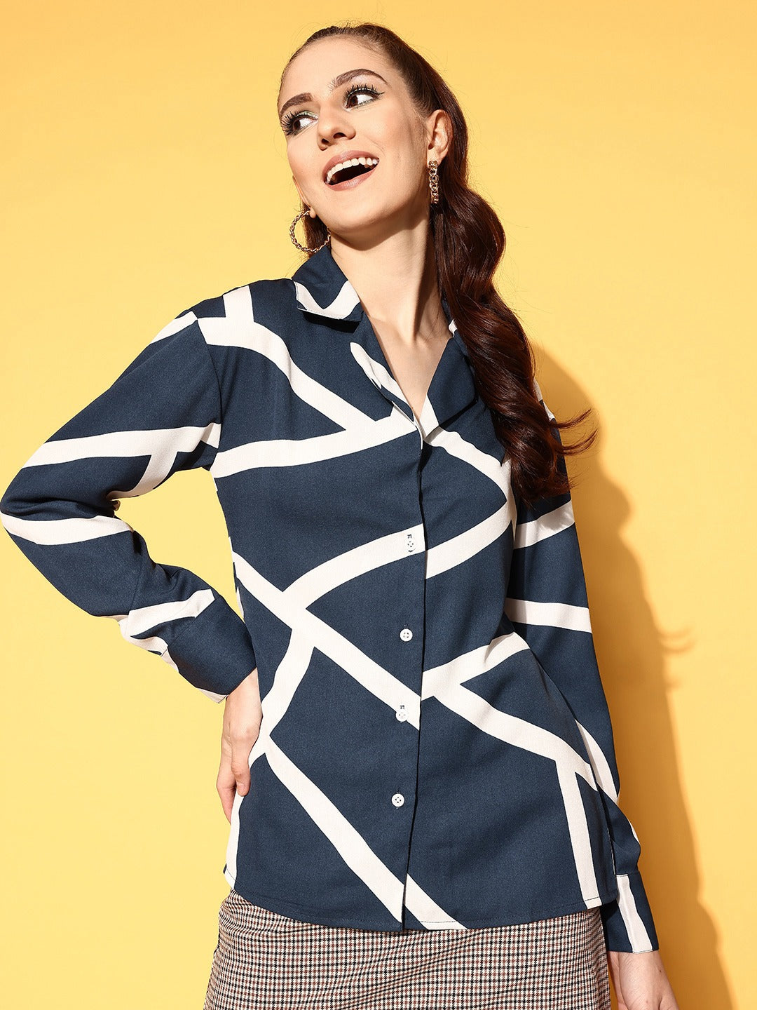 Berrylush Women Navy Blue & White Stripe Printed Collar Neck Front Button-Up Crepe Shirt Top