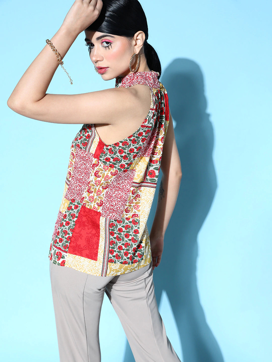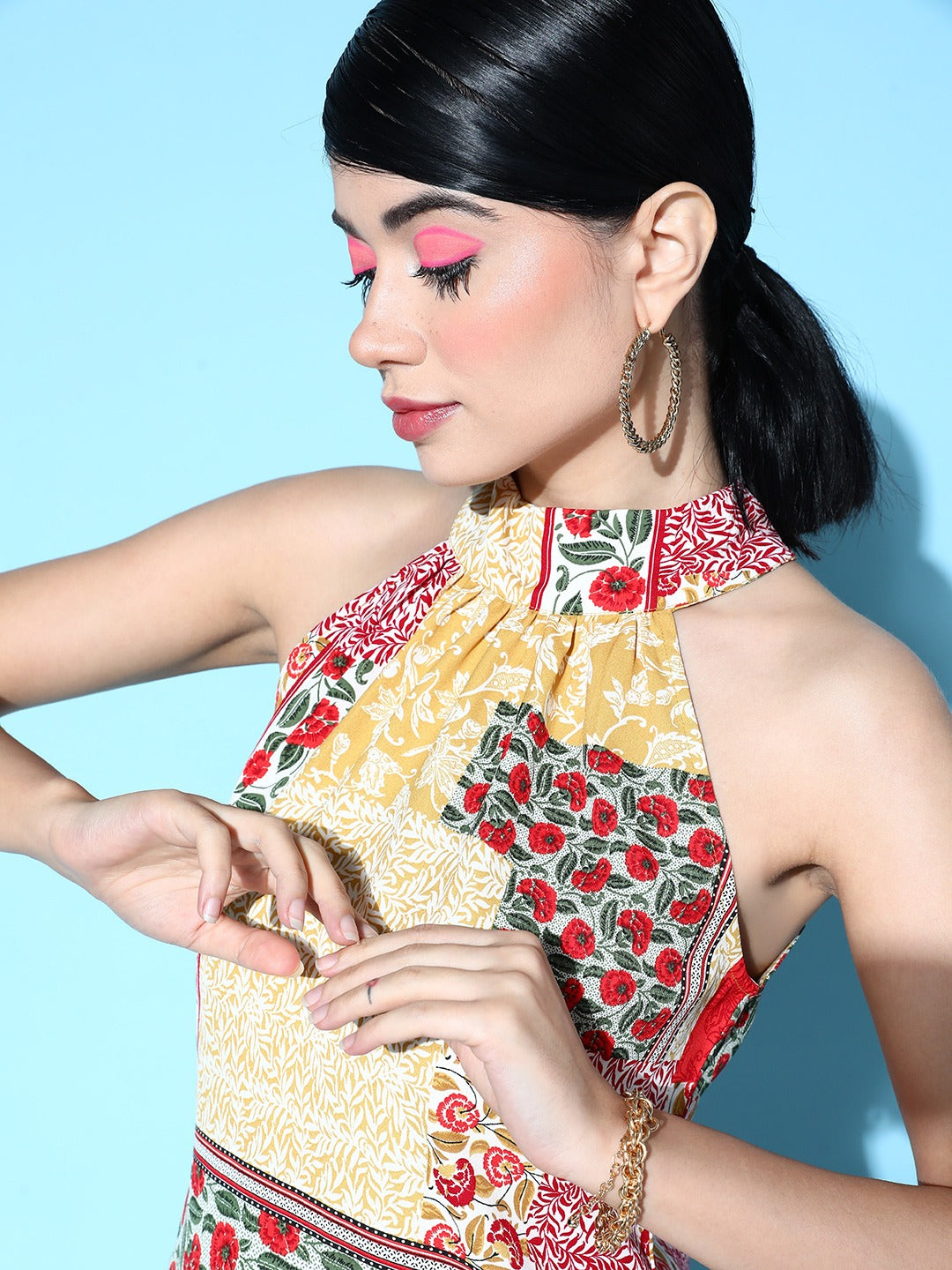 Berrylush Women Red & Yellow Ethnic Motifs Printed Halter Neck Sleeveless Button-Up Crepe Regular Top