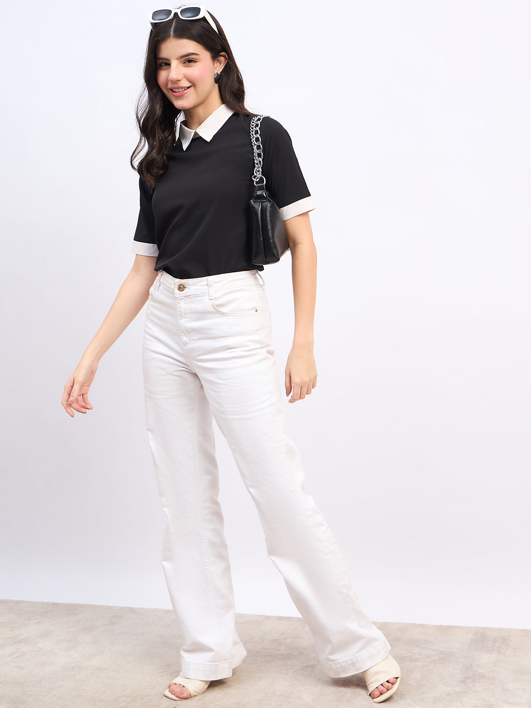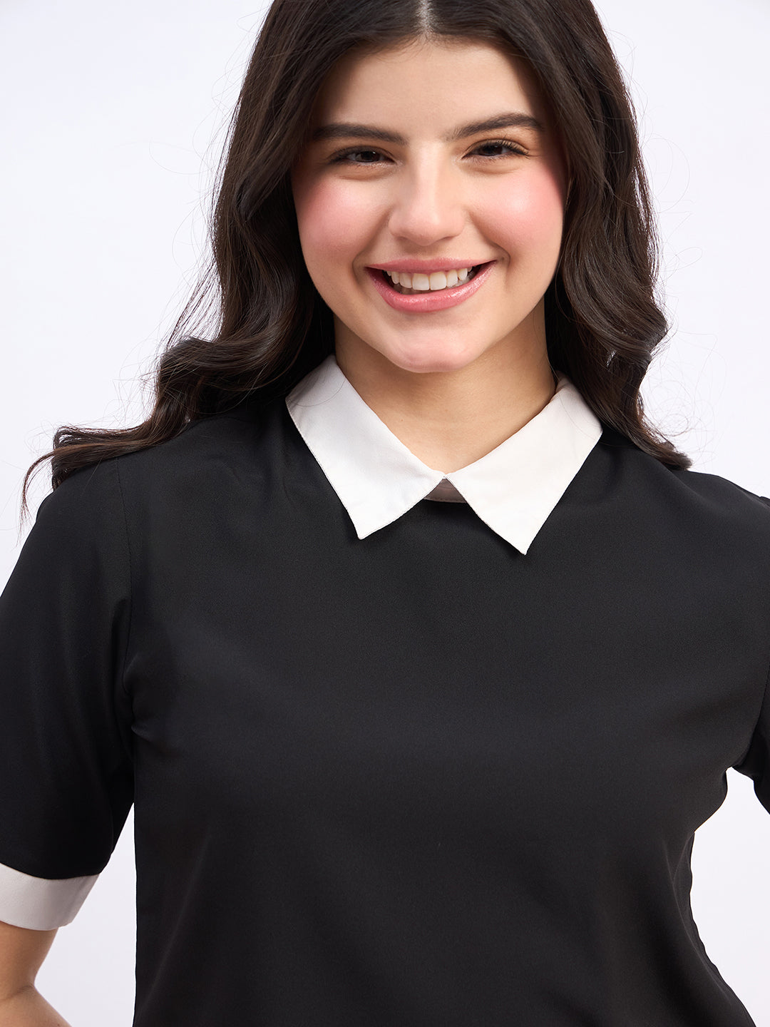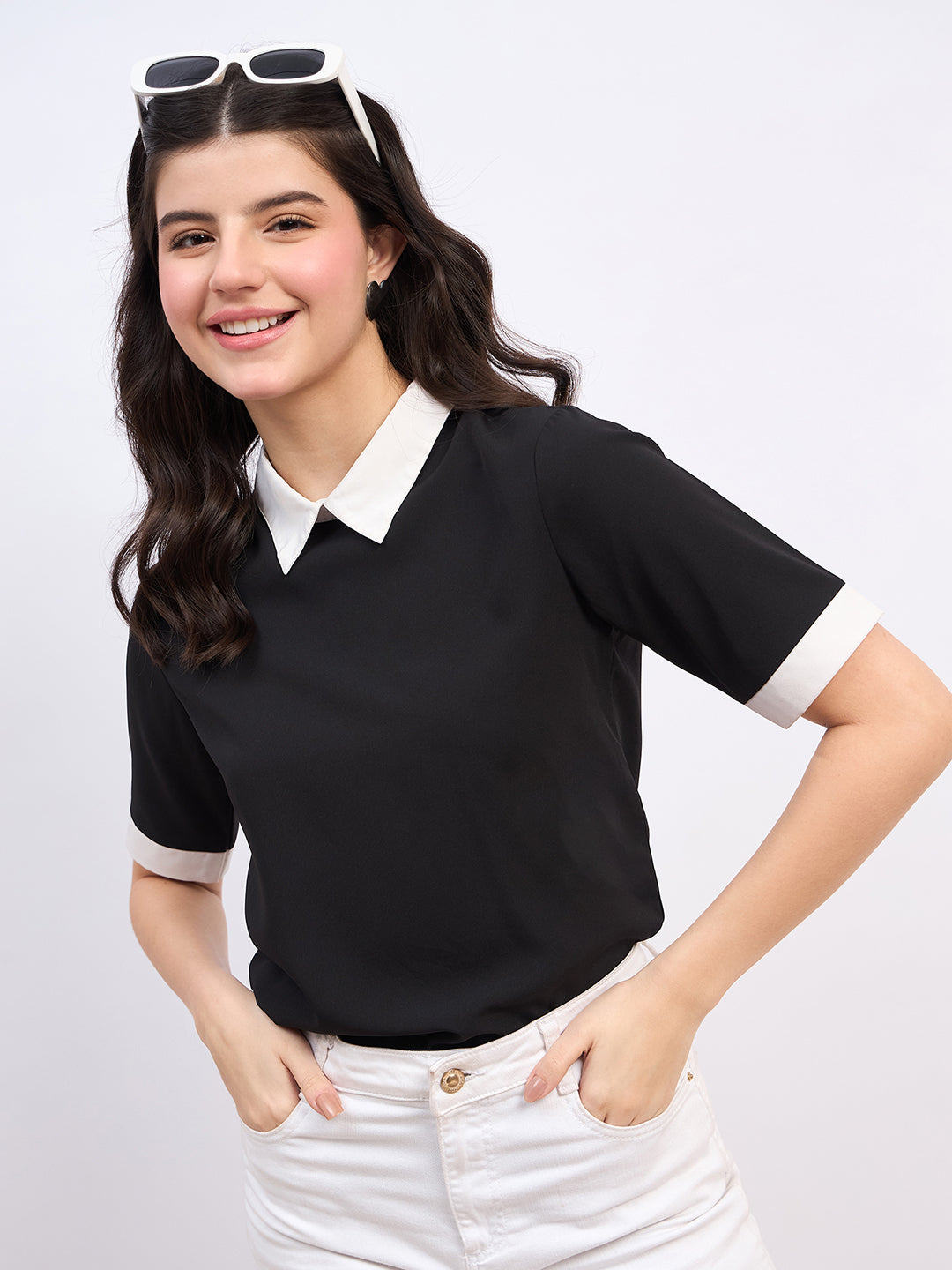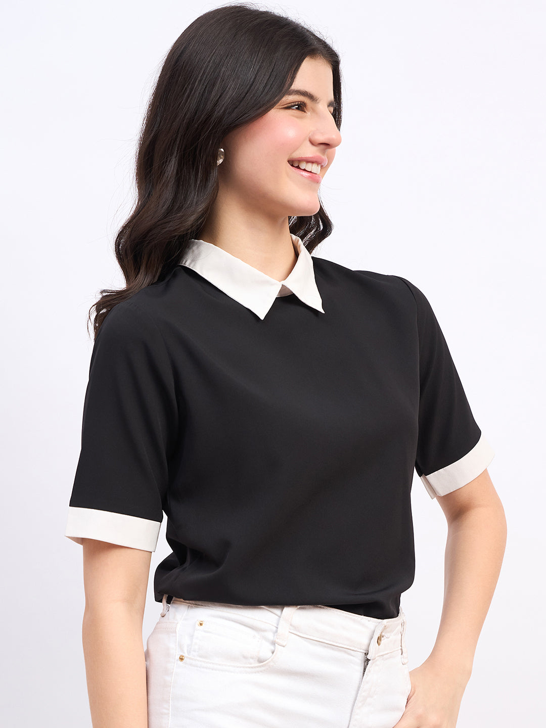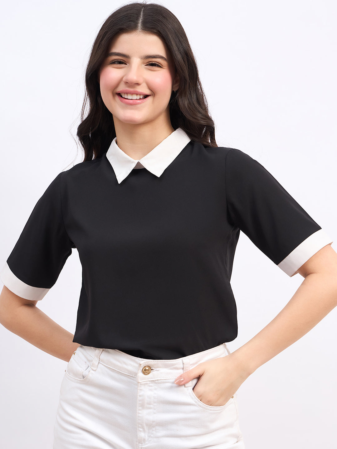 - Black colour with contrast white neckline adds a stunning flair to this top