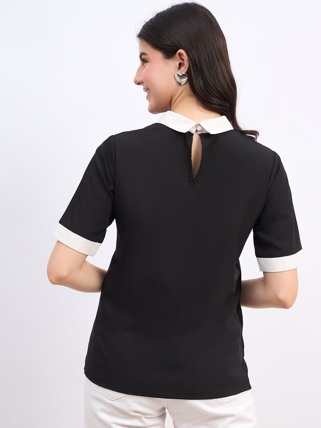Berrylush Women Solid Black & White Contrast Spread Collar Neck Short Sleeves Back Keyhole Straight Hem Regular Top
