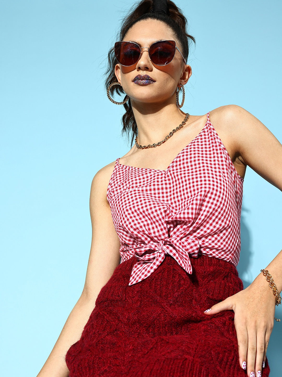 Berrylush Women Red & White Checked Pattern V-Neck Front Tie-Up Cotton Cropped Top