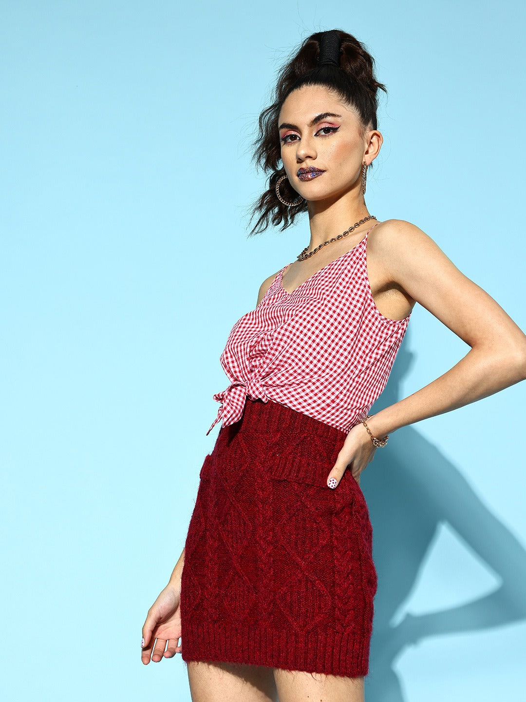 Polish off your capsule closet with chic and versatile options just like this ravishing Checked Red and White Pure Cotton Front Knot Crop Top from the exclusive print and pattern collection of Berrylush. Highlighting bold red and white checked pattern all over that gives this top a striking appearance while giving away a ritzy vibe. The sleeveless design lends your beautiful exposure along with natural freedom of movement. Moreover, the cropped length makes this top appear trendy and exotic with an alluring disclosure to your waist. Partner up this top with a mini skirt, a pair of block heels, cool sunglasses, pearl hoop earrings, and a sassy red sling bag to get a fashion-focused look.