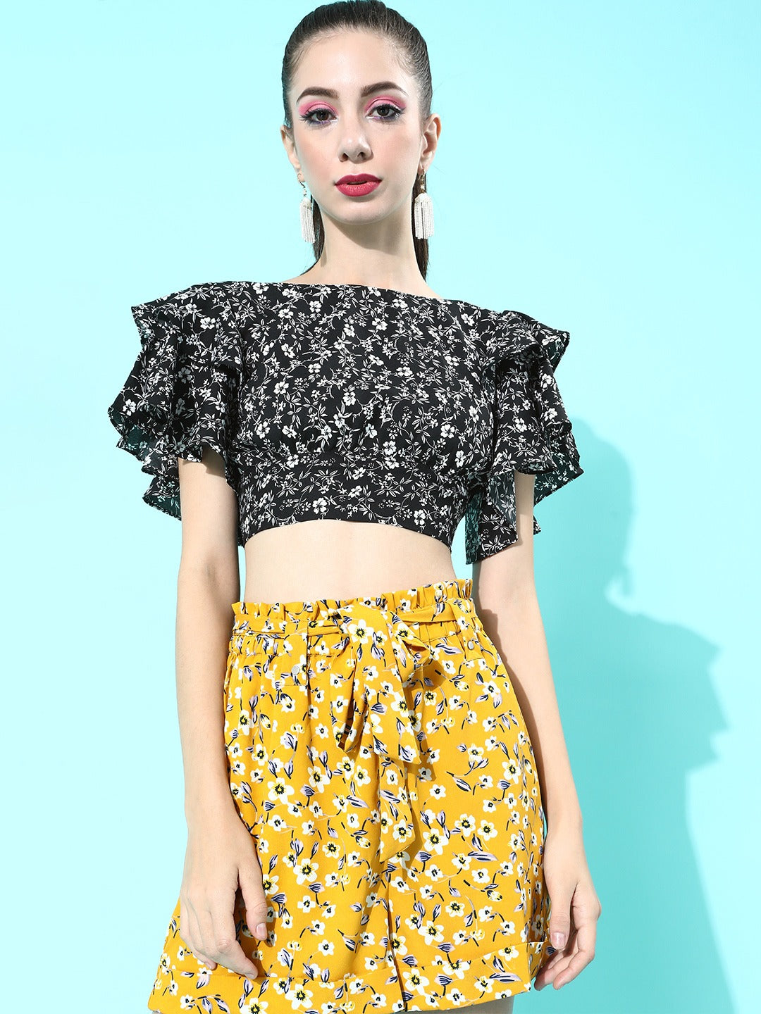 Embrace your love for crop tops this summer season with this charismatic Black & White Floral Printed Boat-Neck Ruffled Crop Top from the summer collection of Berrylush. You will love this crop top as its short flutter sleeve gives decorative appeal to your arms with a ventilation feature. Beautifully designed boat neck gives dignified and graceful appeal to your neckline and the cut-out details elegantly highlight your back part and state out exotic casual look. The tie-up closure presents a mesmerizing appearance while the fitted style assembles a body-hugging outlook. Team up this cinematic crop top with stylish shorts, sunglasses, and sneakers to get an enticing final look.