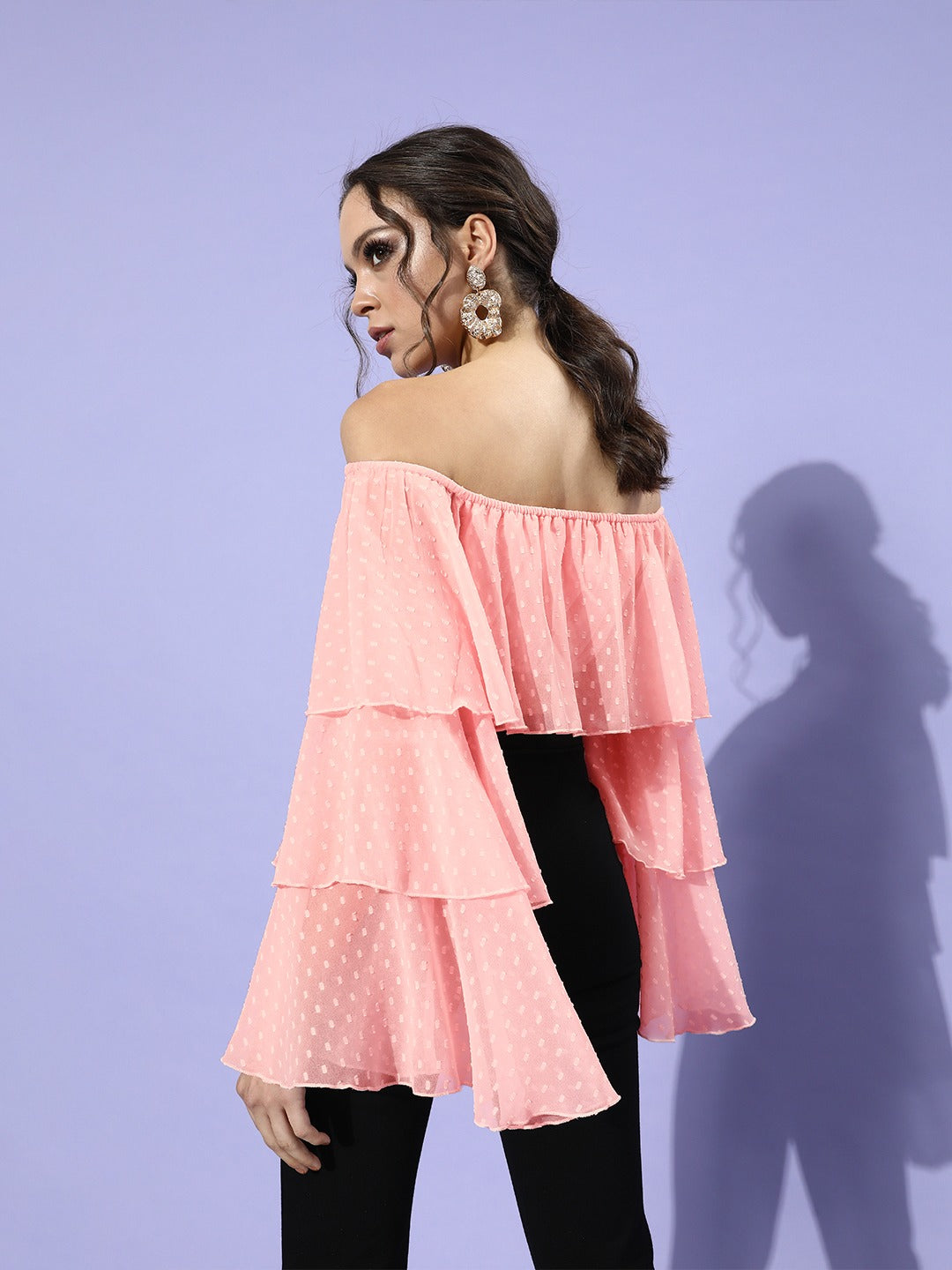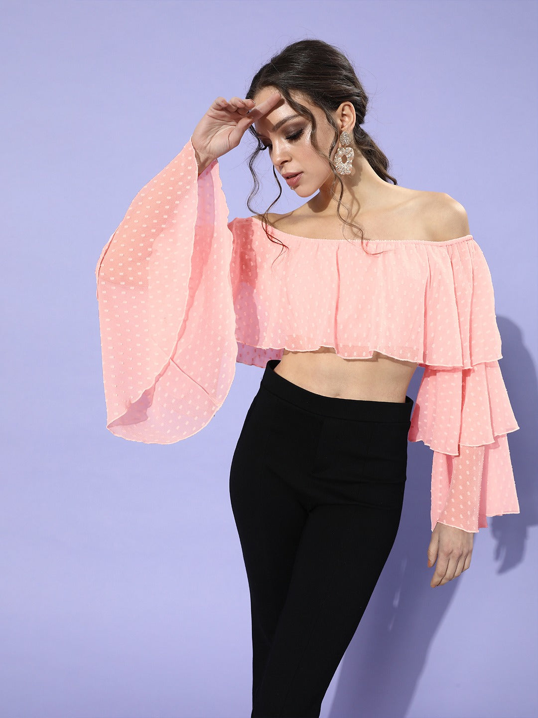 Berrylush Women Solid Pink Dobby Weave Off-Shoulder Neck Sheer Georgette Ruffled Crop Top