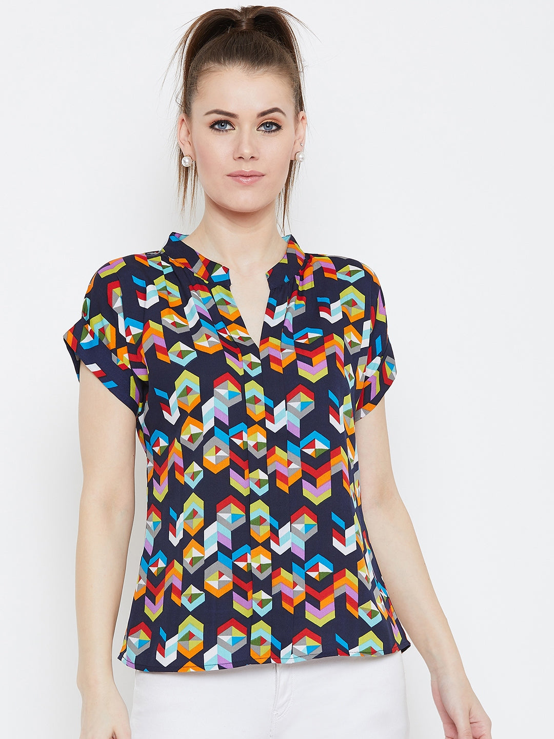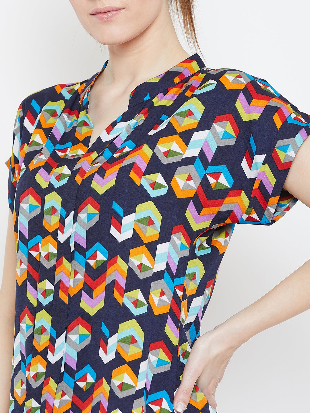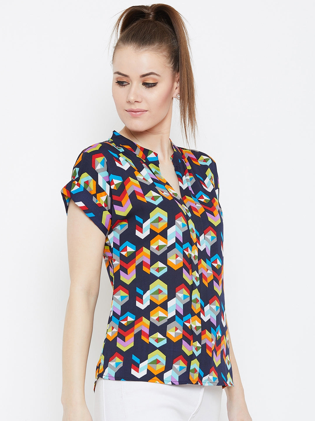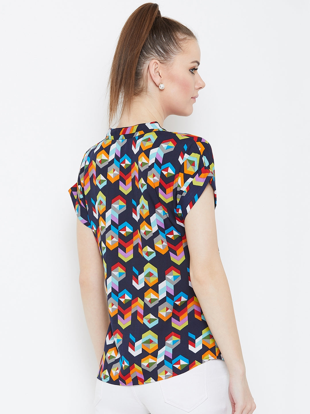 Berrylush Women Navy Blue & Multicolour Geometric Printed Mandarin Collar Neck Shirt Top