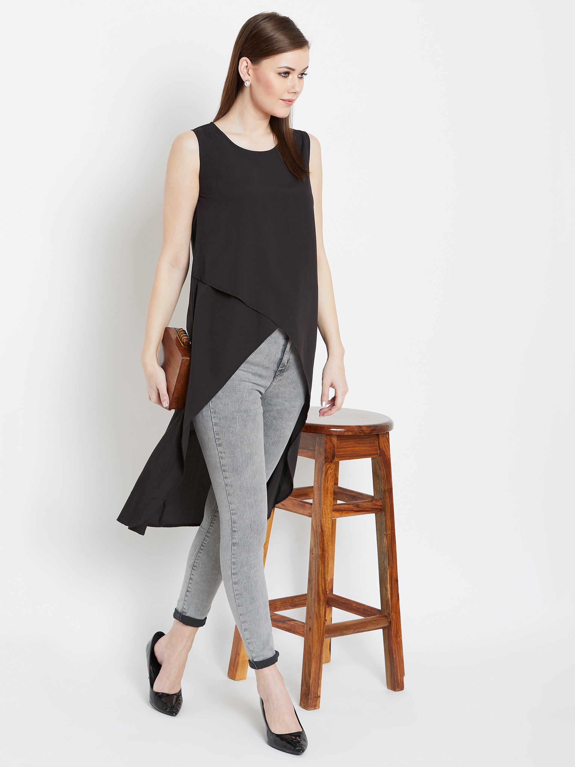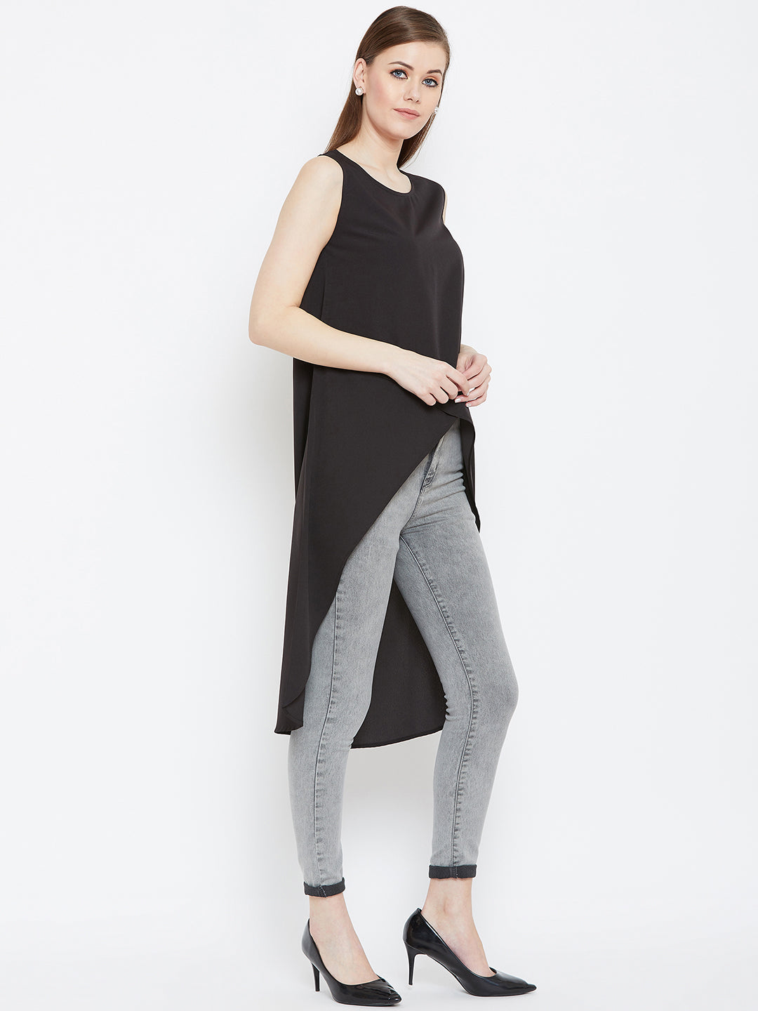 Berrylush Women Solid Black Round Neck Sleeveless High-Low Longline Top