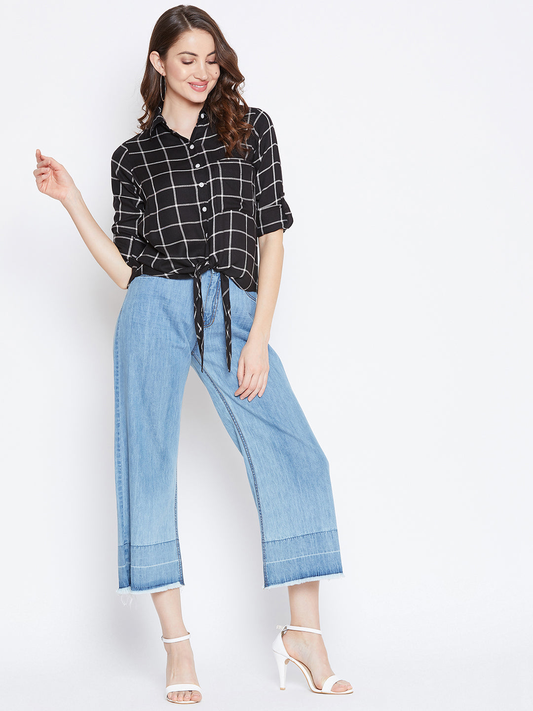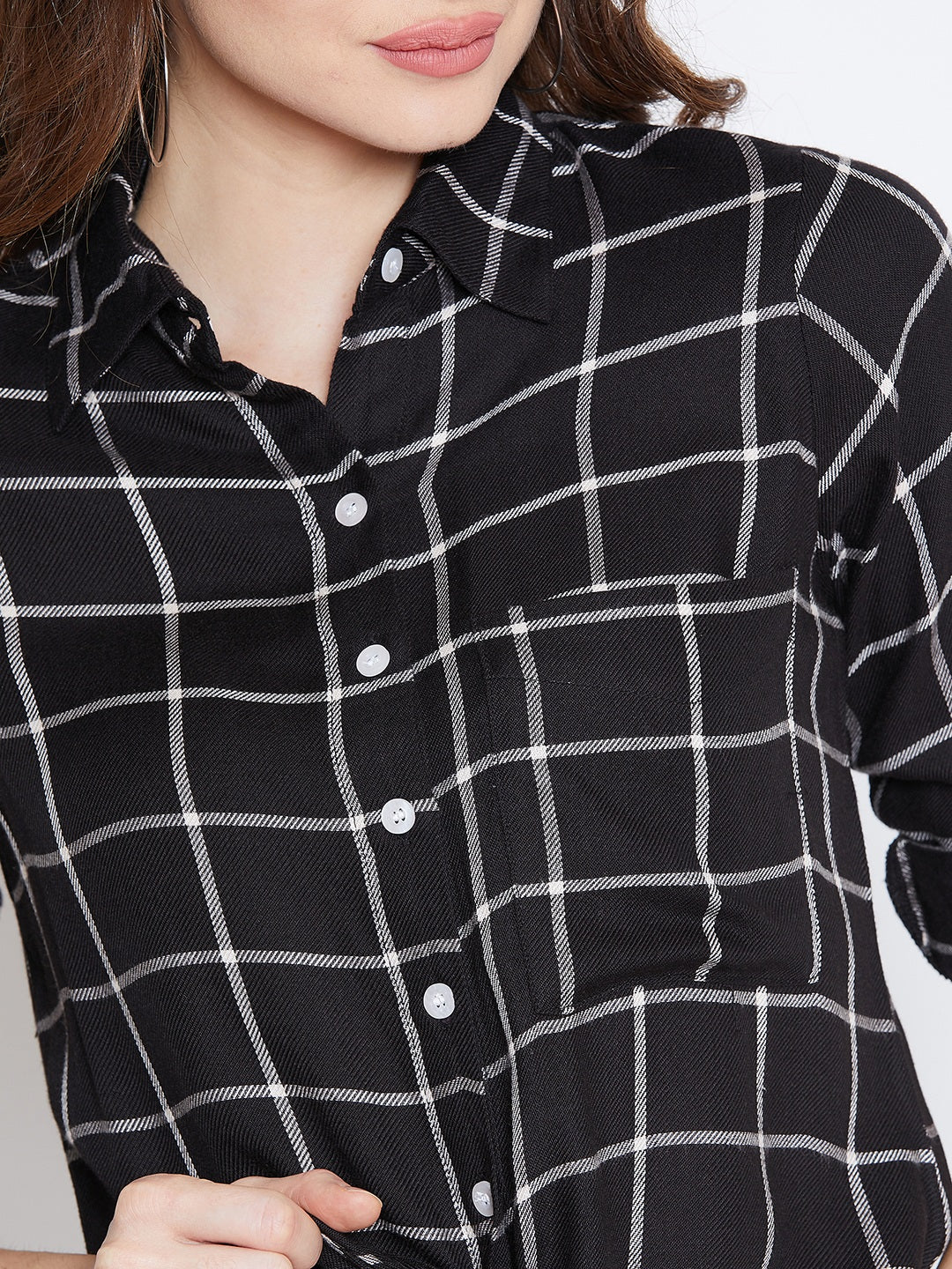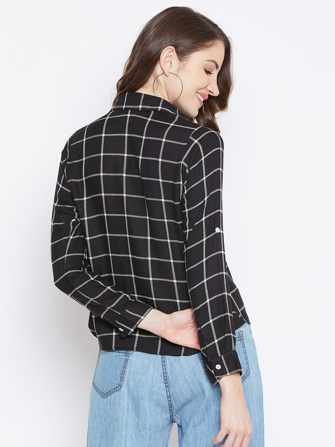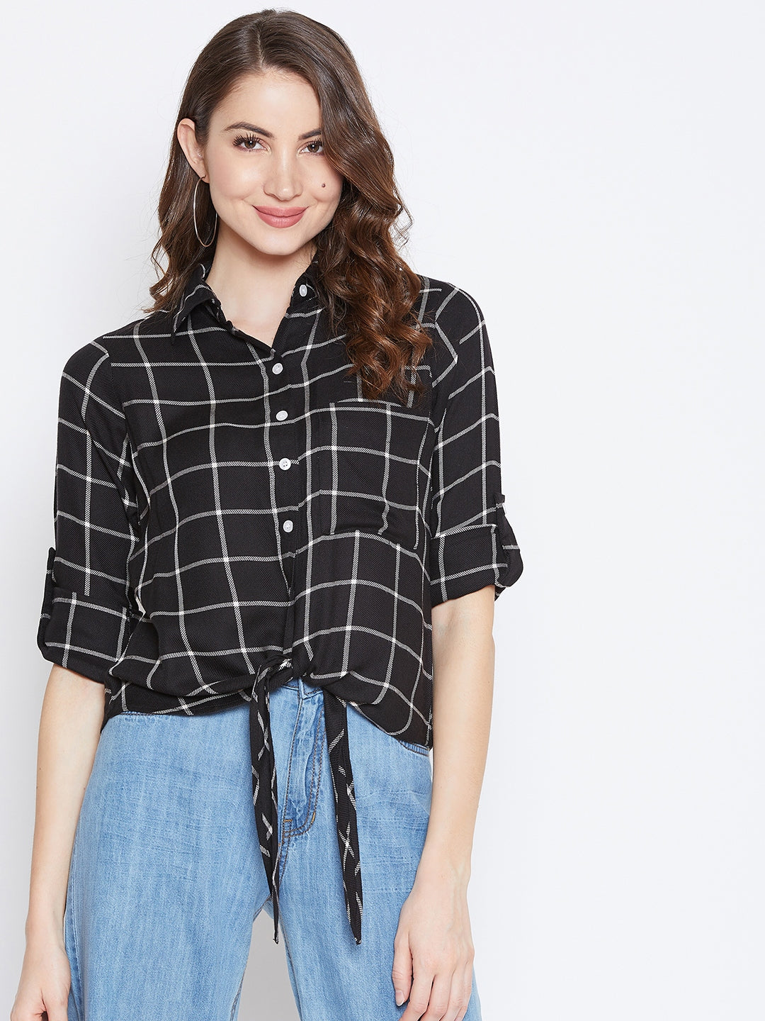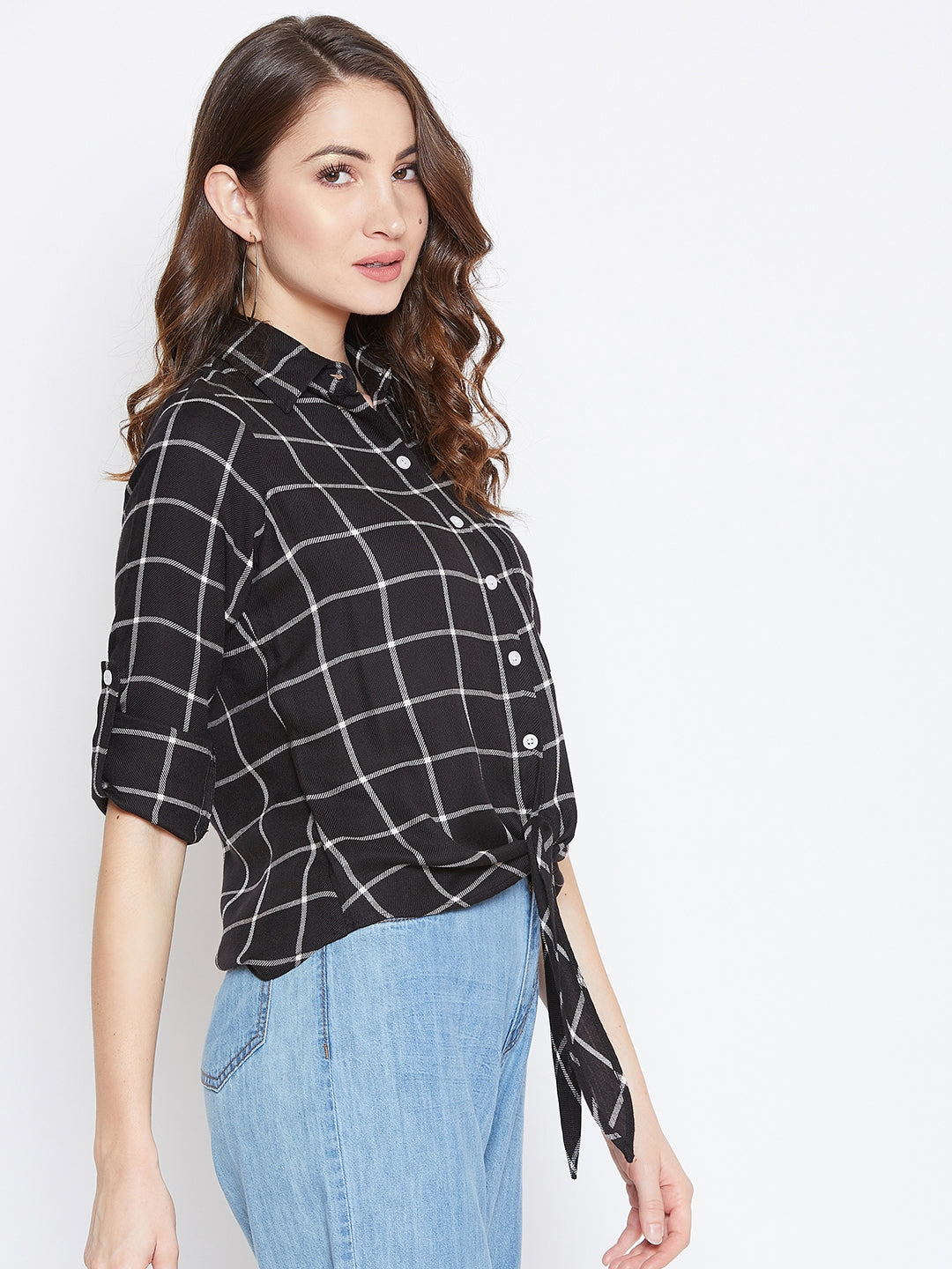 Berrylush Women Black & White Checked Pattern Waist Tie-Up Shirt Style Top
