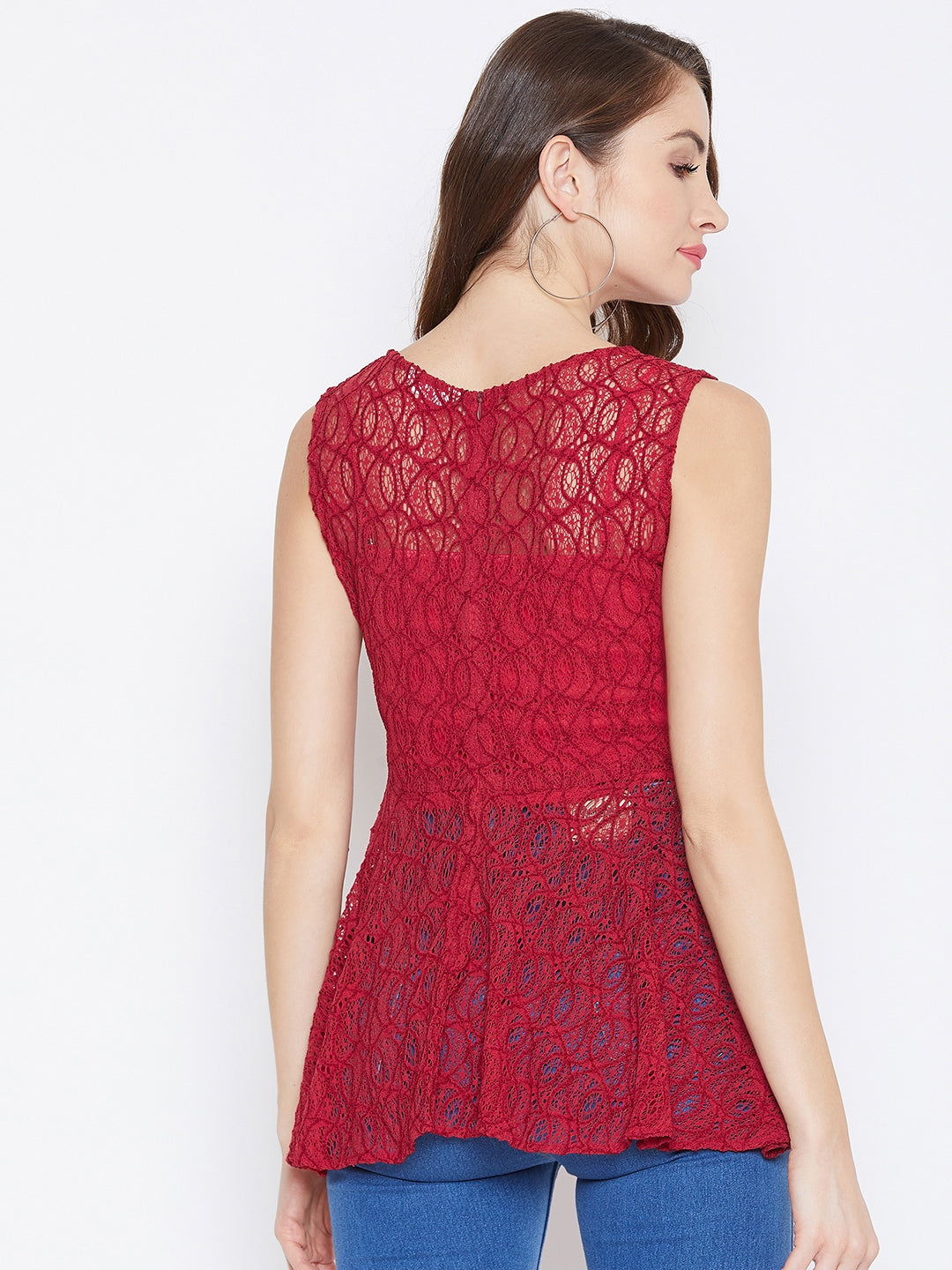 Berrylush Women Solid Dark Red Round Neck Lace Woven Peplum Top
