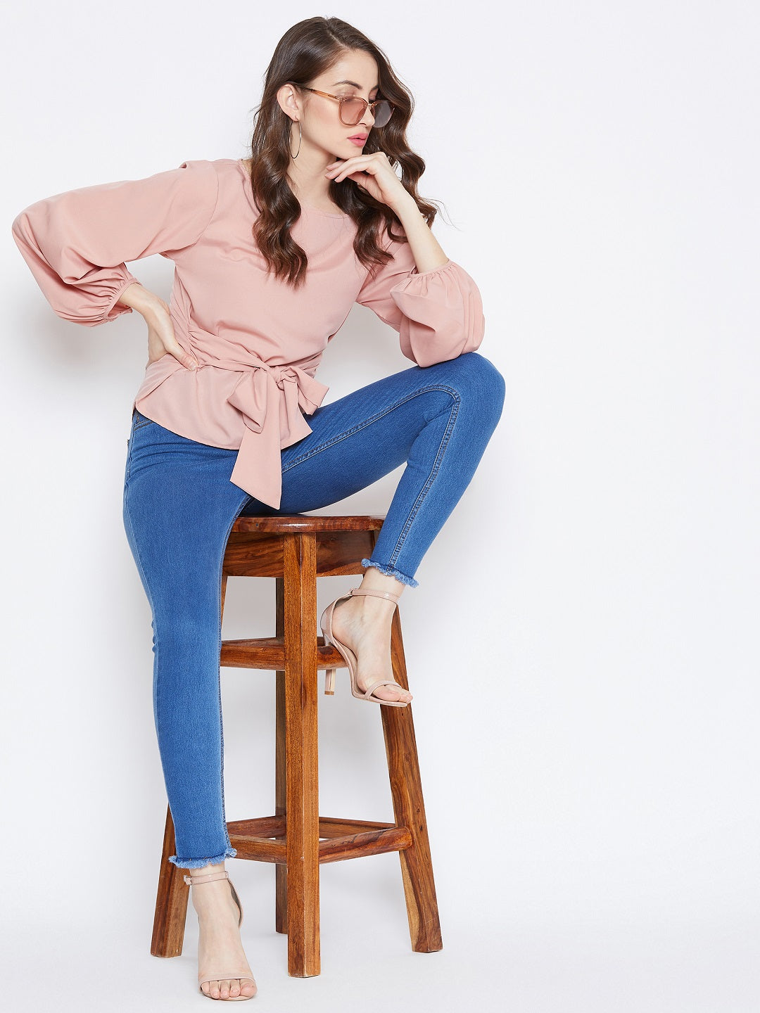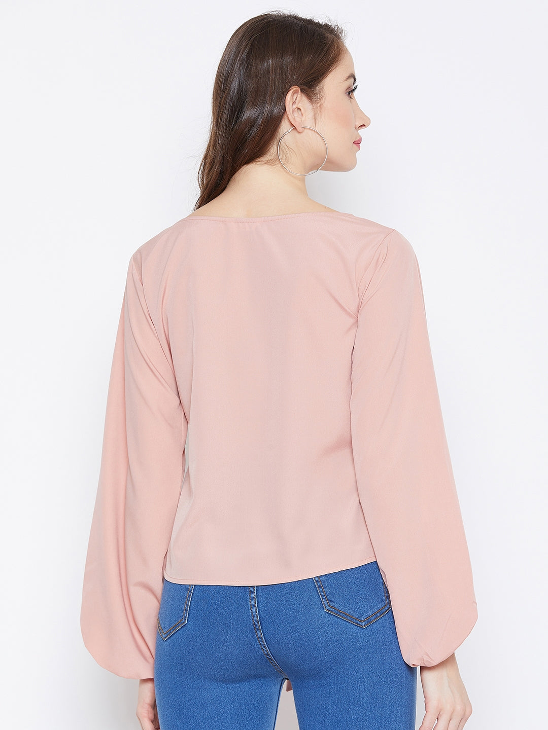 Brighten up your urban wear collection this autumn by adding calming spirit with this charming Solid Peach Boat Neck Bishop Sleeve Waist Tie-Up Top introduced by Berrylush. You will love this top as the cinematic amalgam of peach shade with solid pattern depicts your passionate and warm personality along with voguish essence. Three-quarter bishop sleeves of the top give charismatic appeal to your arms while the regular length adds a neat sheen to your casual look. Waist tie-up surface styling enables you to make a stylish statement as it gets the desired fit and curve-hugging figure. You can partner up this stunning tie-waist top with a pair of sleek black jeans, minimalistic silver jewellery, and a pair of block heels to add feminine charm.