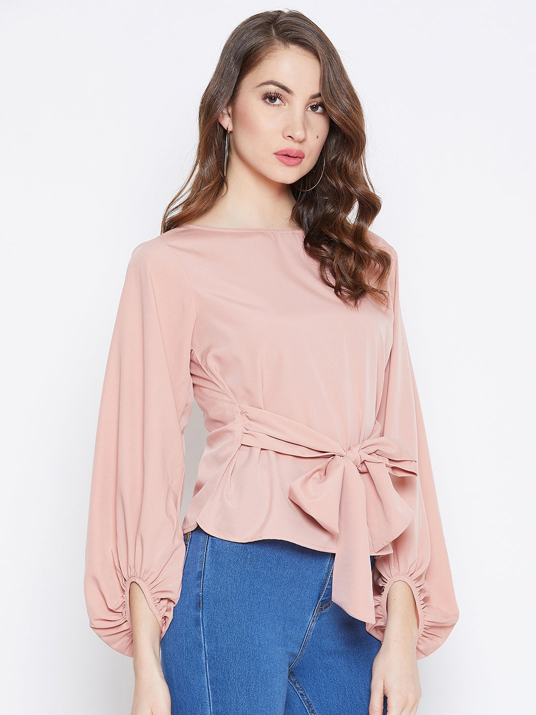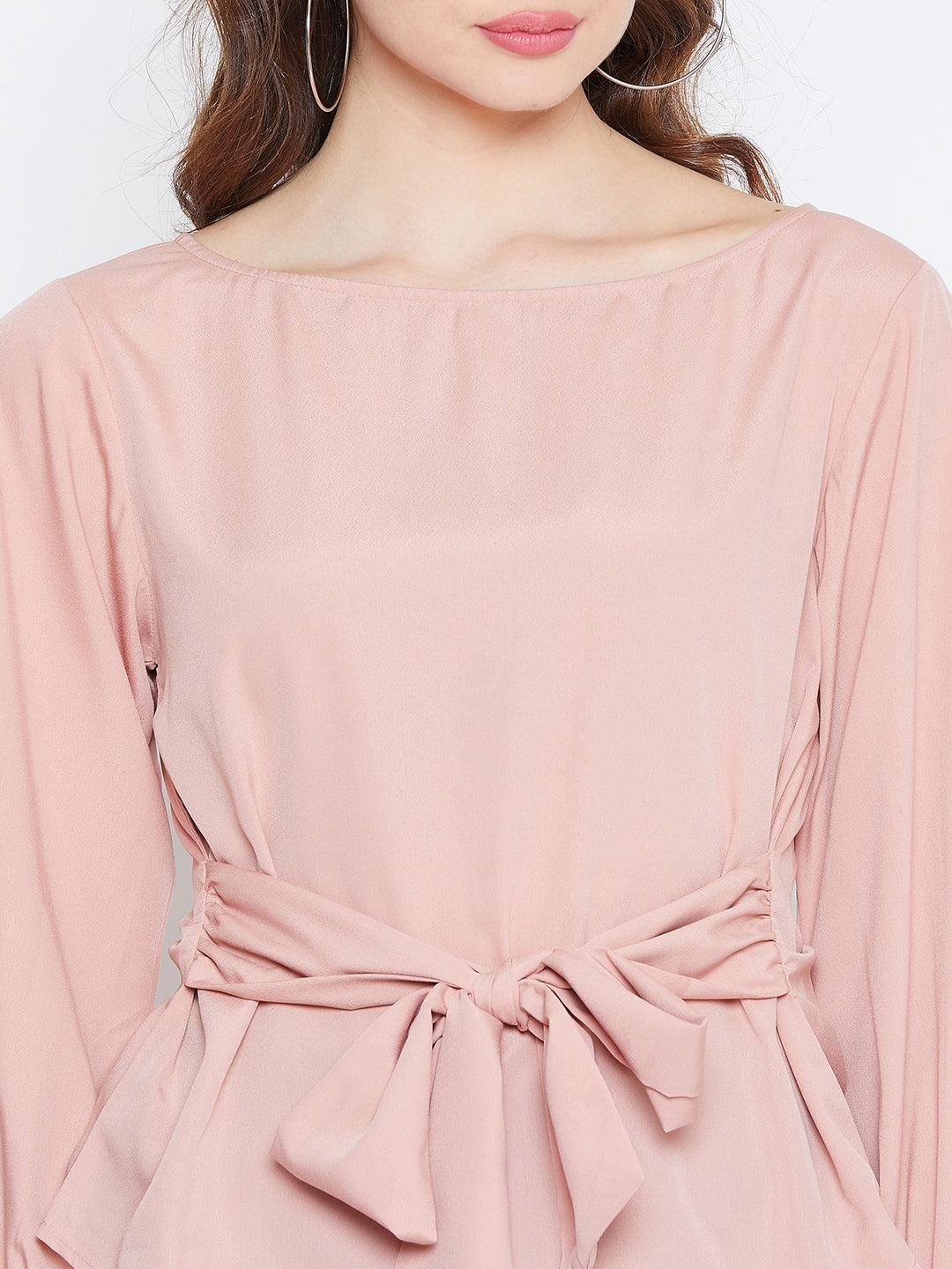 Berrylush Women Solid Peach Boat Neck Bishop Sleeve Waist Tie-Up Top