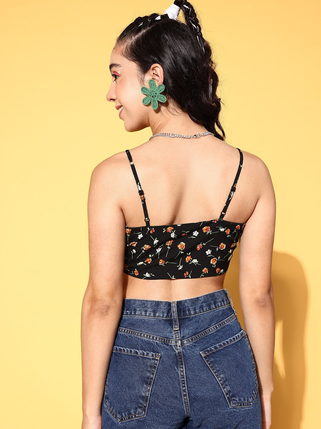 Berrylush Women Black & Orange Floral Printed Square Neck Crepe Crop Top