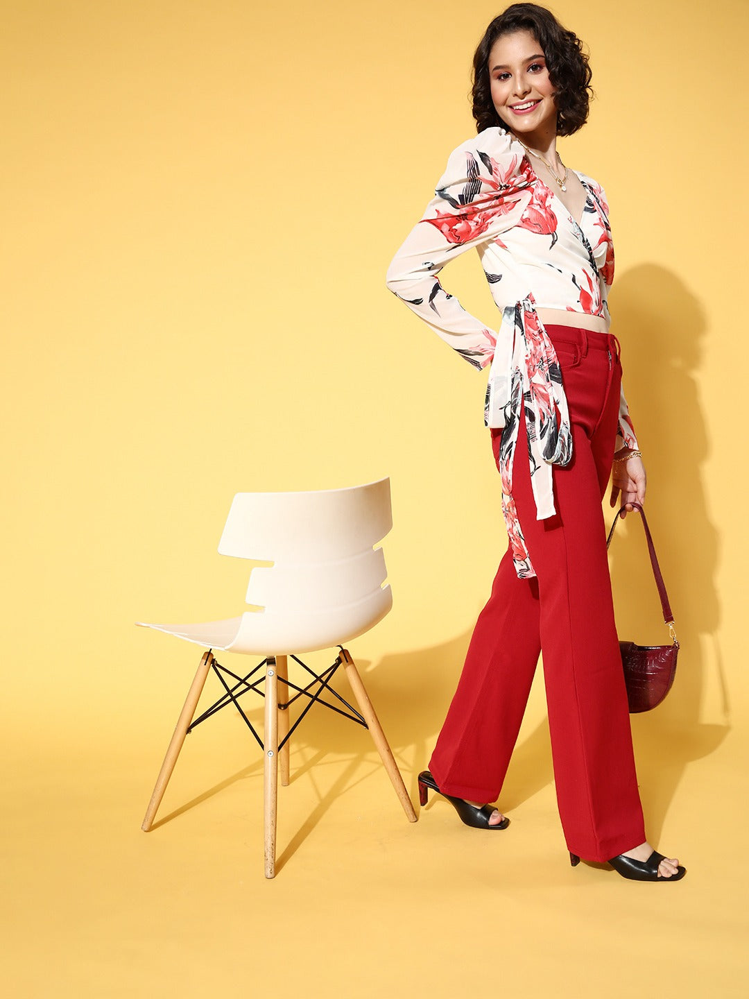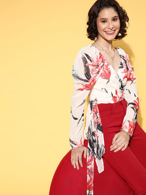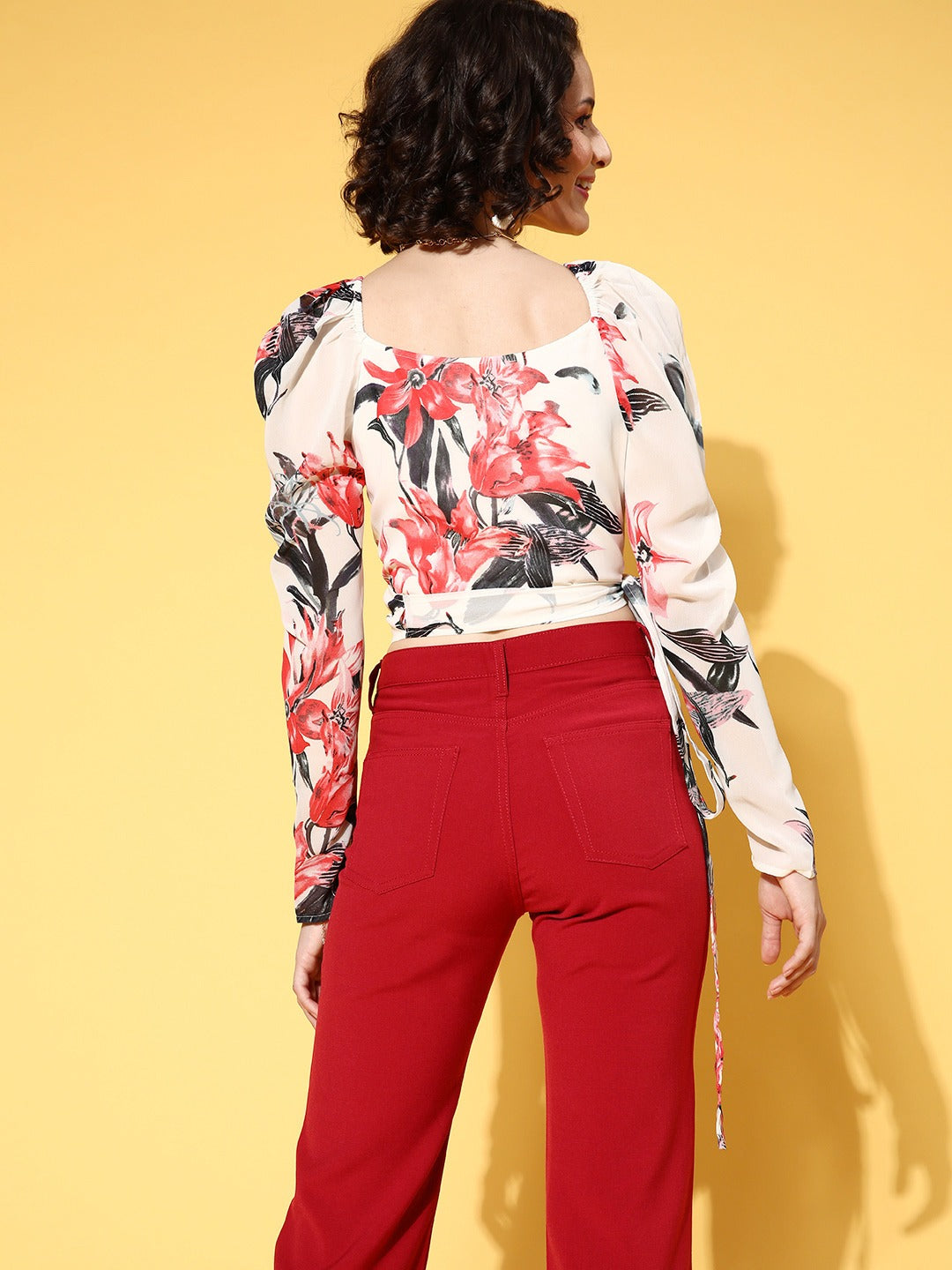 Fill your wardrobe with the brightest and boldest style options just like this captivating White & Red Floral Printed Sweetheart Neck Waist Tie-Up Wrap Crop Top designed by Berrylush. This top is must have as it comes with long-puff sleeves that give your arms an attractive cover and also makes this top an appropriate outfit for every season and weather condition. Spun from georgette fabric and polyester material that adds an amazing drape to this top with a high absorbency feature to give a vibrant sheen. Also, this top comes with waist tie-up surface styling that injects an ornamental and gleaming finish to your look. Wear this wrap top with high-waist jeans, a classy pendant, and a stylish handbag to get a charming look.