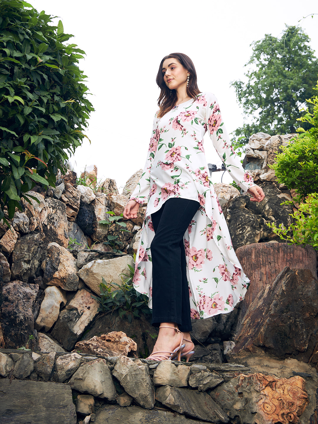 Introducing the latest masterpiece from Berrylush - a stunning fusion of fashion and floral elegance. This White, Pink, & Green Floral Printed Round Neck High-Low Hem Longline Top is a must-have addition to your wardrobe that exemplifies casual sophistication. Crafted with care in high-quality polyester fabric, it features an enchanting floral print spreading across its canvas like a dreamy garden in bloom. The elegant round neckline complements the unique high-low hemline, effortlessly enhancing your silhouette. With long sleeves that offer regular styling and an opaque finish guaranteeing premium comfort and privacy, this woven wonder is perfect for any casual outing where style is key. Elevate your fashion game with this exquisite piece by Berrylush.