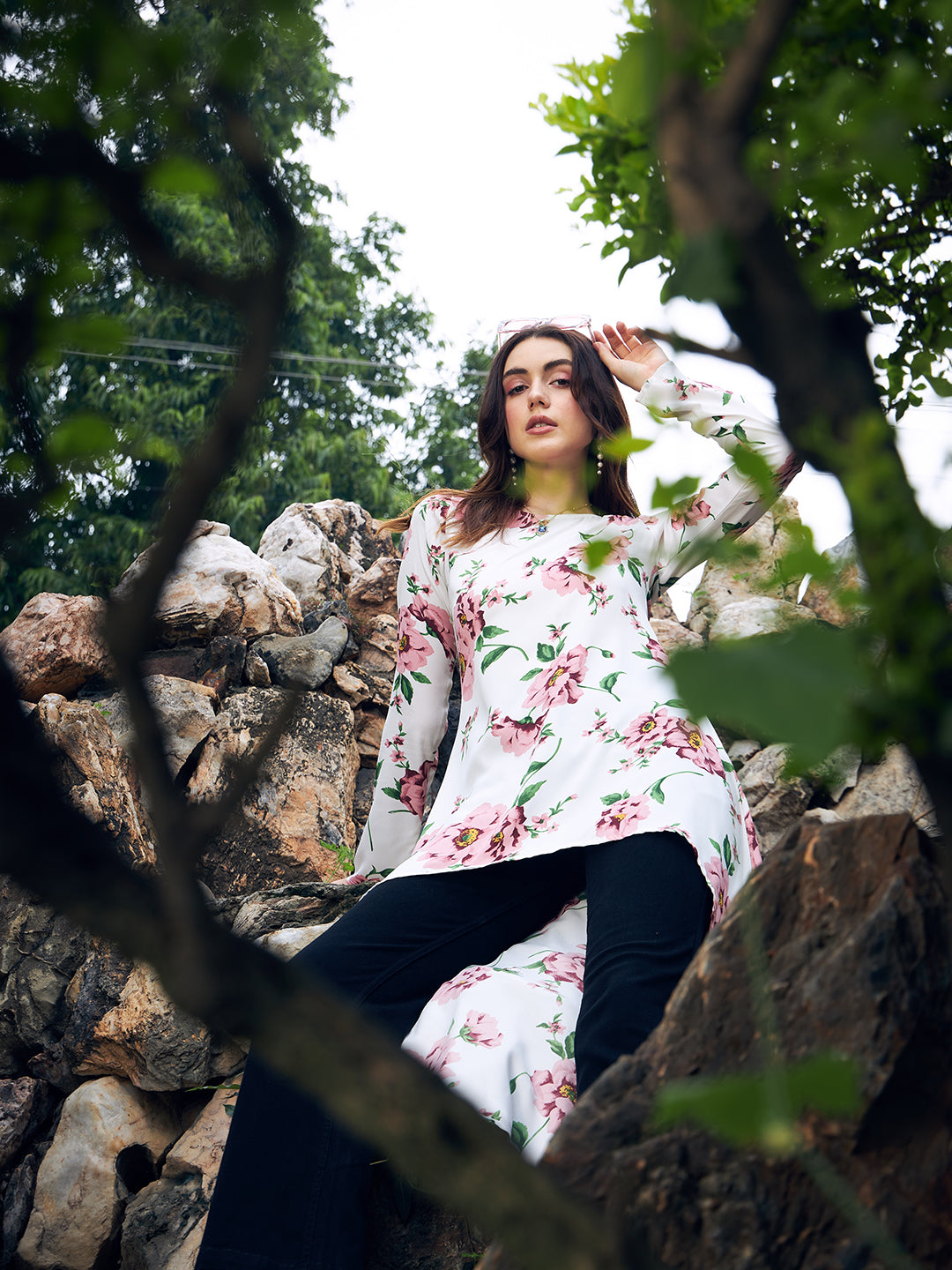Berrylush Women White, Pink, & Green Floral Printed Round Neck High-Low Hem Longline Top