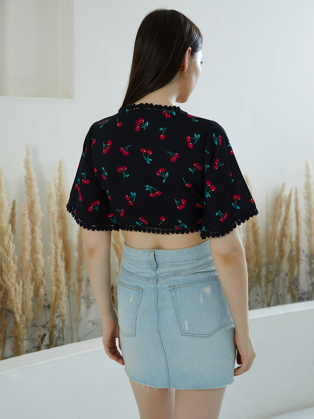 Berrylush Women Black & Red Cherry Printed V-Neck Lace Waist Tie-Up Shirt-Styled Crop Top
