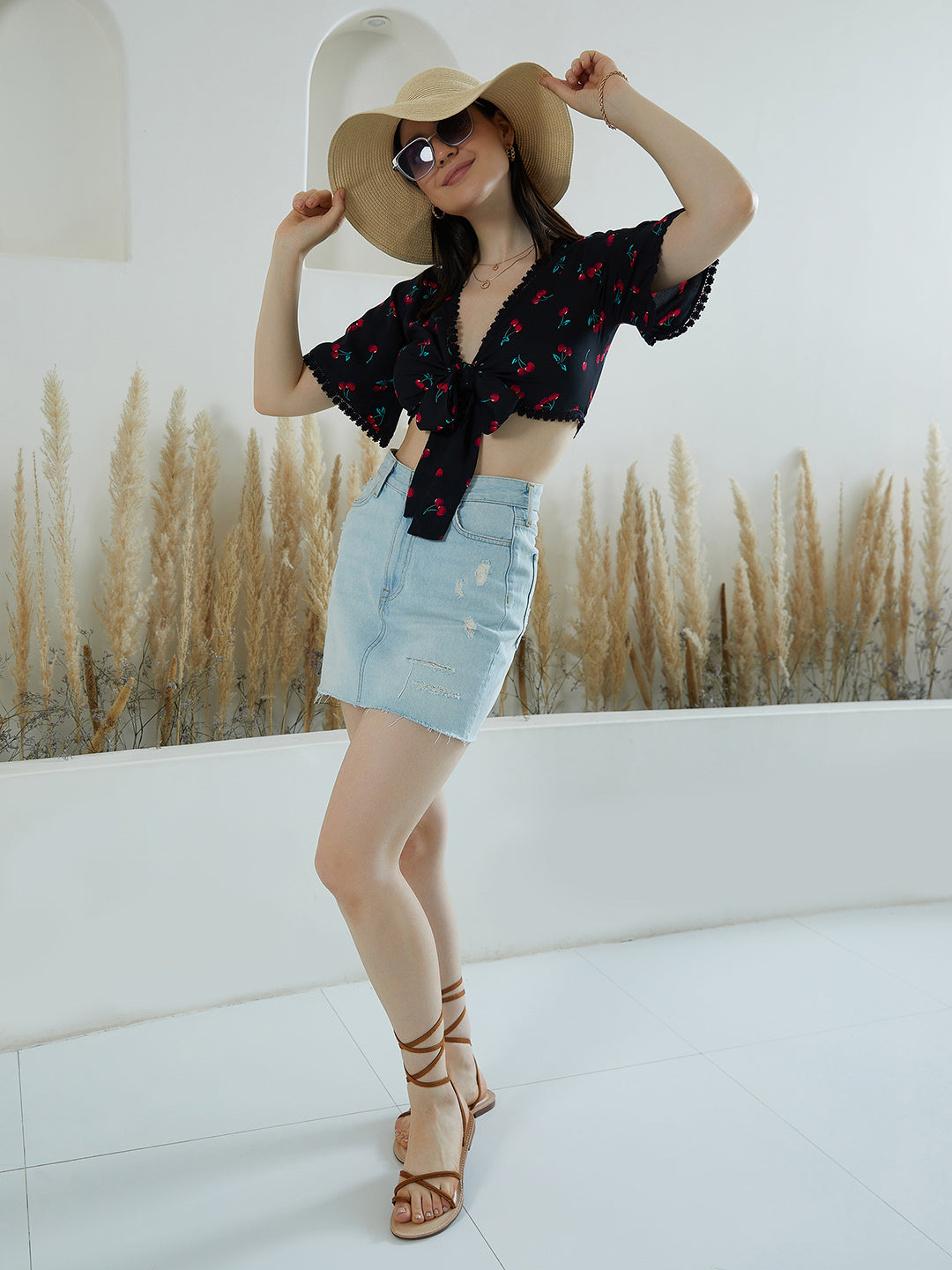 Refine your casual edit with fascinating style just like this bedazzling Black & Red Cherry Printed V-Neck Lace Waist Tie-Up Shirt-Styled Crop Top from Berrylush. Fashioned with conversational cherry print in a black shade that gives off a ritzy vibe and further intensifies your overall look. Gracefully designed with shirt style that lends this top a shirt styling illusion making it appear modest yet classy. That's not all, the waist tie-up surface styling provides you with a contouring silhouette with an additional fitting option. Mix and match this cute shirt-style crop top with a straight mini skirt, a pair of block heels, and a stylish handbag for a vintage-style appearance.