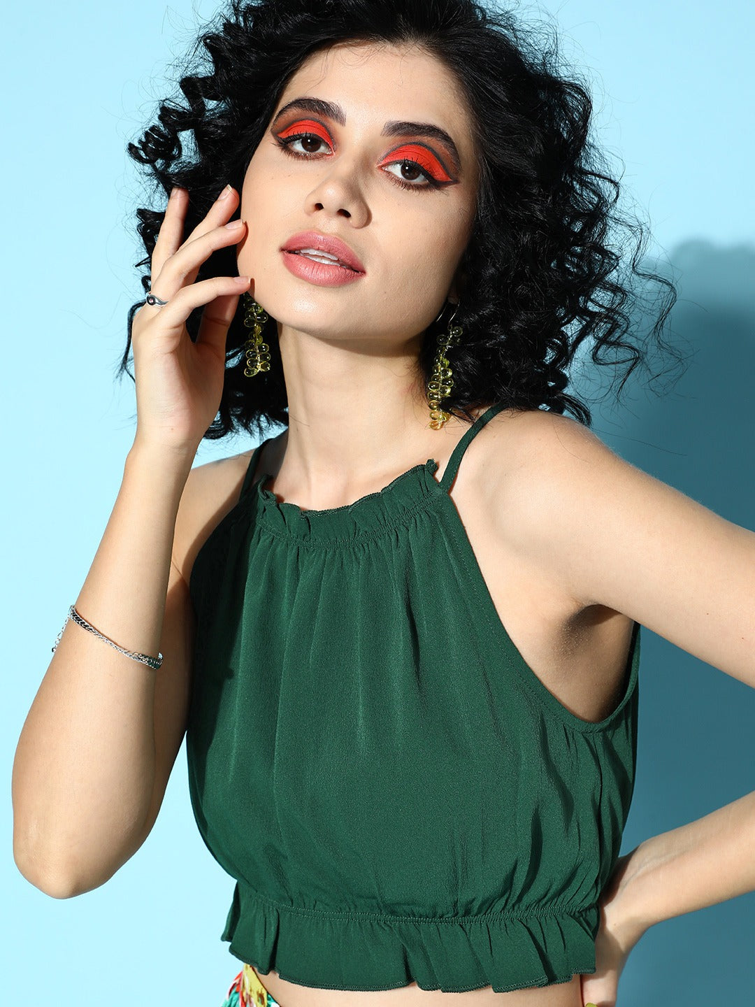 Embody modern charm with a voguish twist and classy hues by adding in your cart this glamorous Solid Green Round Neck Sleeveless Tie-Up Back Crepe Cropped Top from the latest casual wear collection launched by Berrylush. Adorned with a round neck design that lends your neckline a smart definition without exposing much skin along with excellent breathability. Rendered from lightweight polyester material to offer this top has quick-drying and sweat-wicking properties to keep your body comfortable even on hot days. The woven detailing amplifies the overall formation and virtual appearance of this top. Complete your look beautifully by teaming it with a mini skirt, pump heels, and a chic handbag.