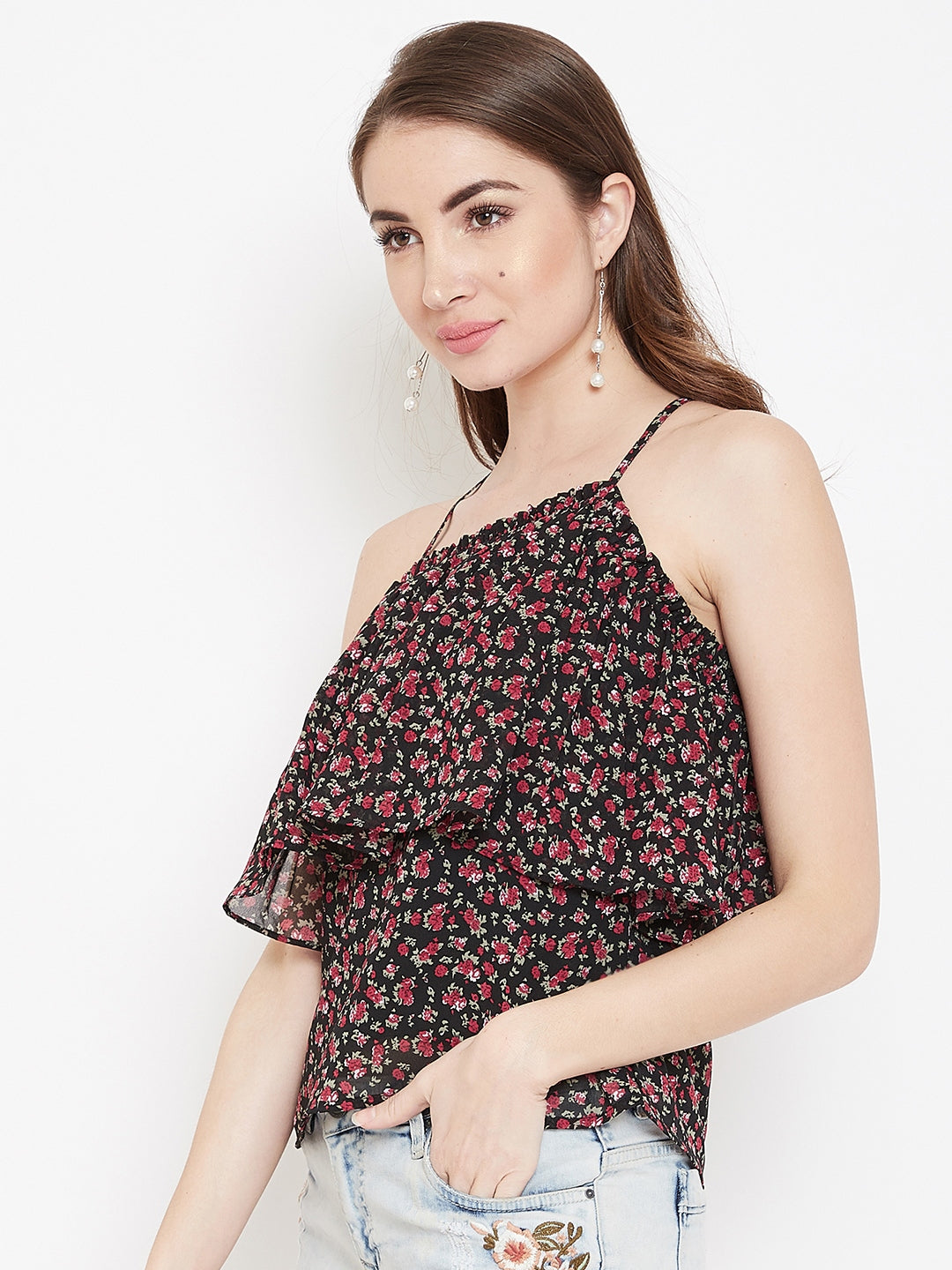 Berrylush Women Black Floral Printed Sleeveless Tiered Top