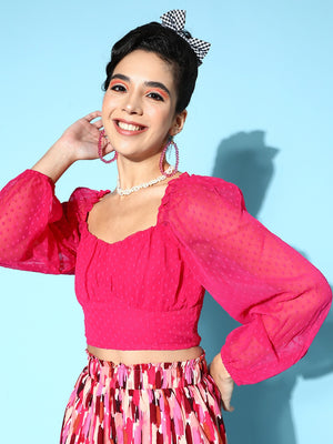 Berrylush Women Solid Pink Dobby Weave Sweetheart Neck Georgette Semi-Sheer Pleated Empire Crop Top