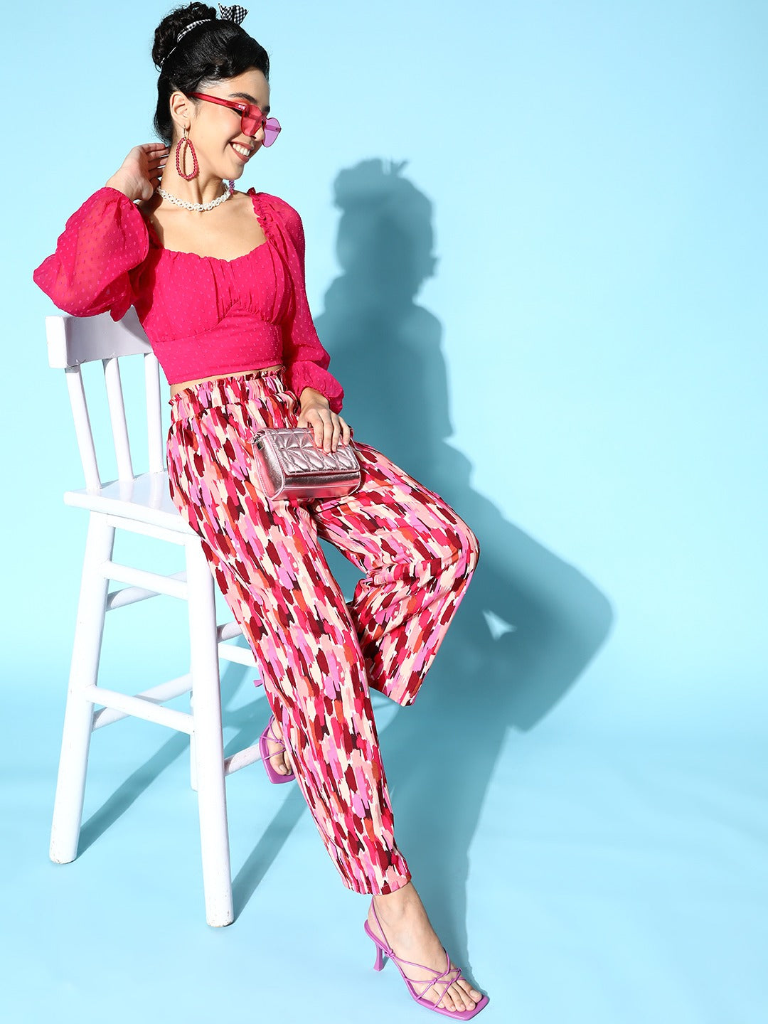 Enliven your casual wardrobe with smart and fashion-flattering addition by selecting this astonishing Solid Pink Dobby Weave Sweetheart Neck Georgette Empire Crop Top introduced by Berrylush. The most adorable style element of this top is its sweetheart neckline that injects a romantic vibe to this top with a lovely heart shape to your neck. Beautifully designed with long-puff sleeves that adjoin amusing drape to this top with voluminous coverage to your arms. Also, the knitted detailing gives this top a hint of elastic nature with improved structural integrity and a sleek finish. Get a fabulous look for your next date by wearing this top with high-waist trousers, a pair of block heels, a pearl pendant, and a chic handbag.