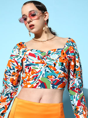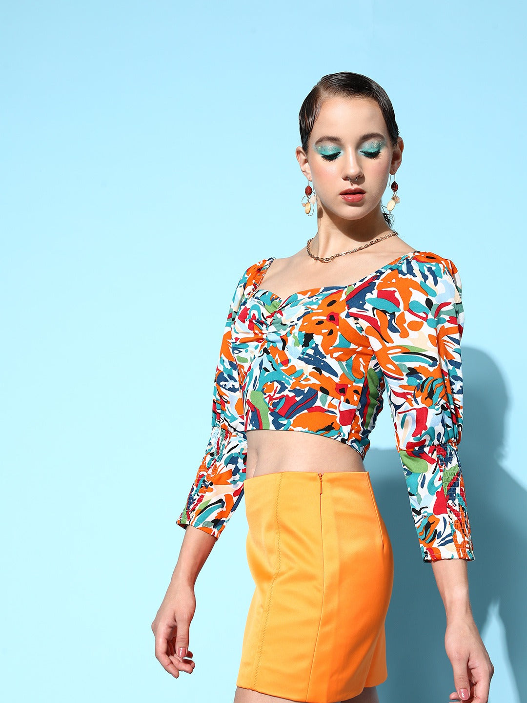 Berrylush Women White & Orange Abstract Printed Sweetheart Neck Three-Quarter Sleeve Smocked Crepe Crop Top