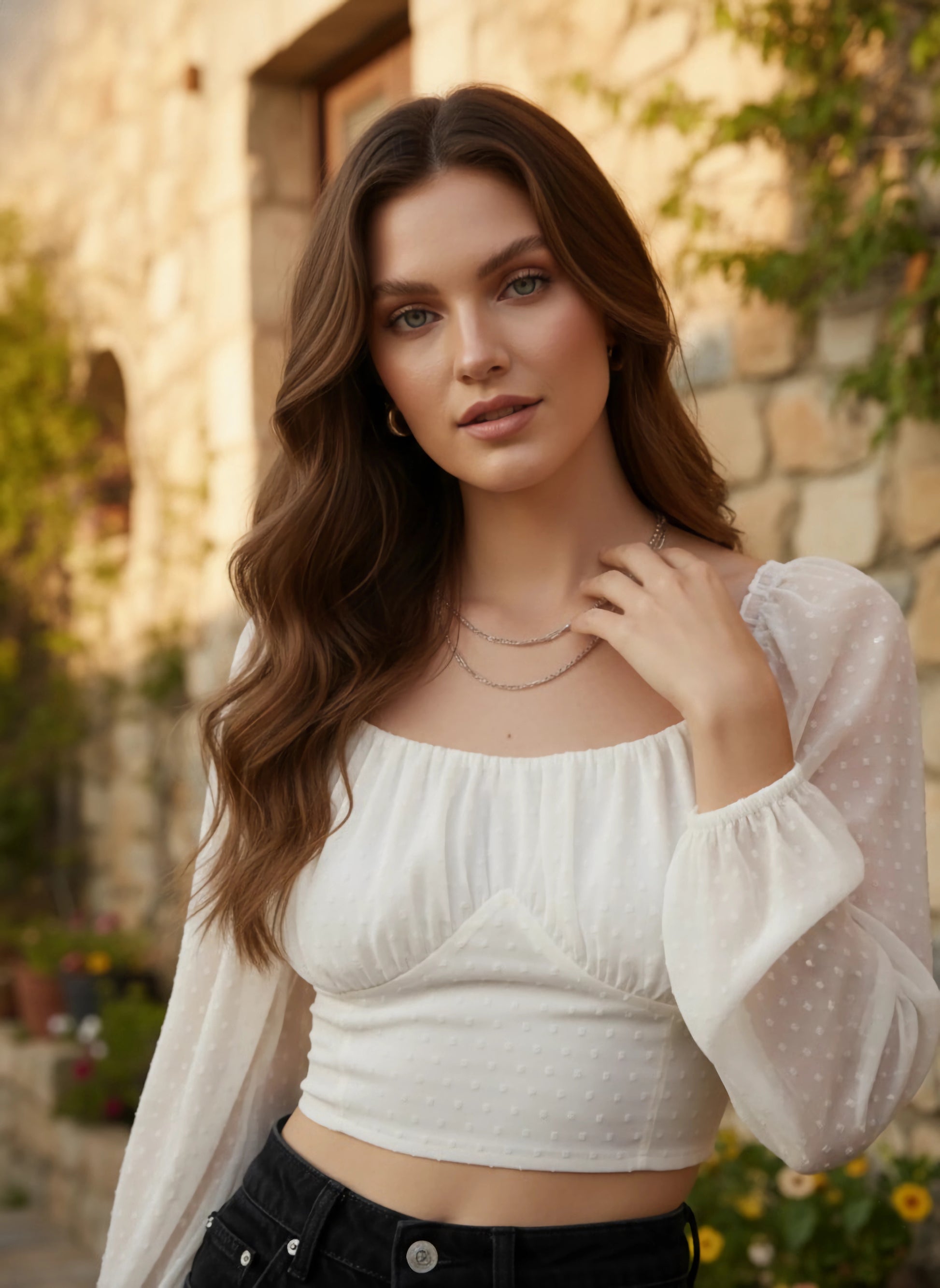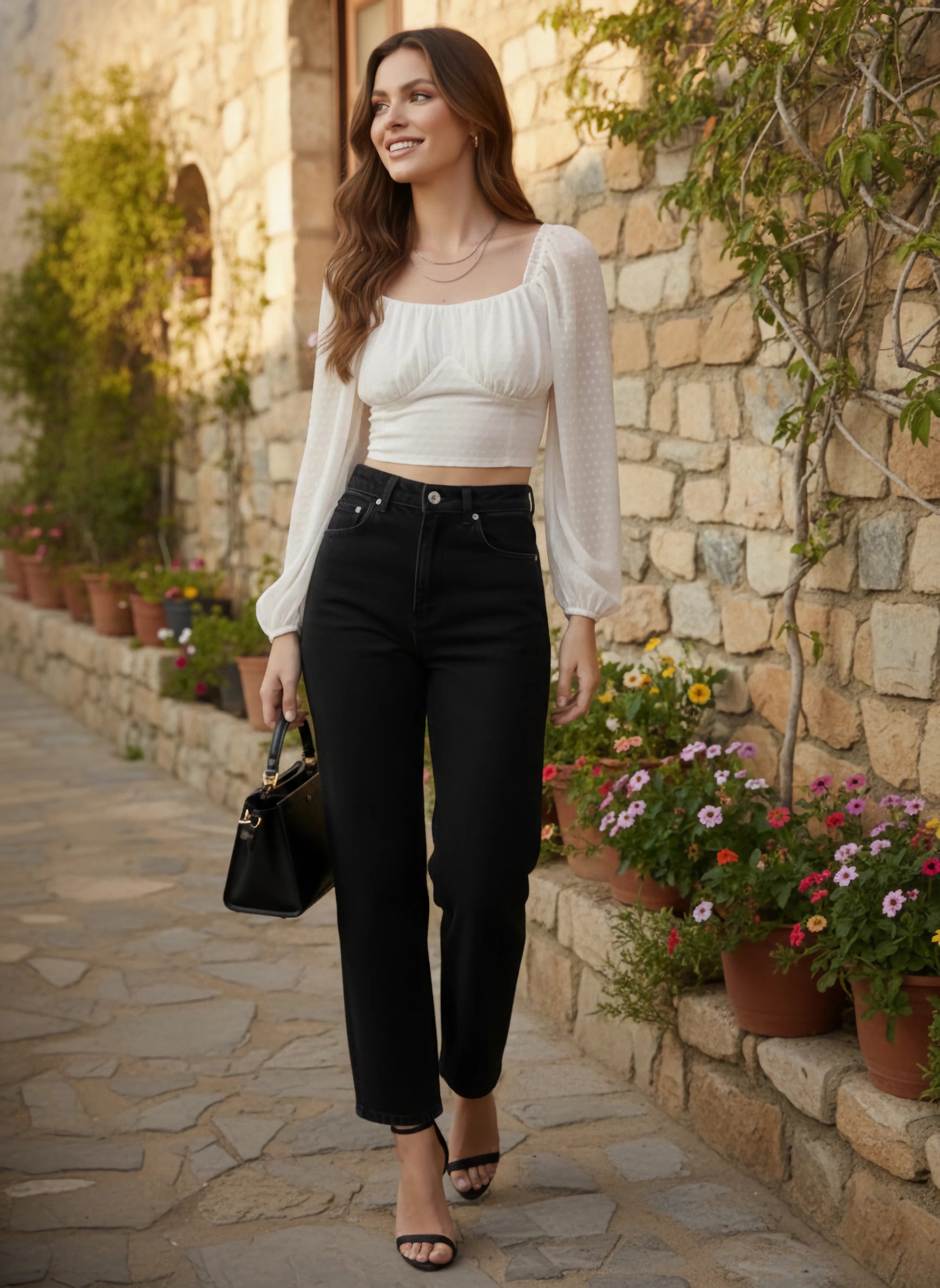 Imbue timeless style notes with a tinge of elegance by opting for this classy White Dobby Weave Sweetheart Neck Empire Crop Top introduced from the latest casual wear collection of Berrylush. Fashioned with a sweetheart neck design that gives your neckline a half-heart shape with a flattering outline. Displaying long-puff sleeves that lend your arms semi-sheer coverage with a hint of retro style. Crop length makes this top appear boho-chic with an alluring exposure to your curves. Create a fashion-focused look by teaming this top with a black mini skirt, a pair of black loafers, hoop earrings, and a trendy side bag.