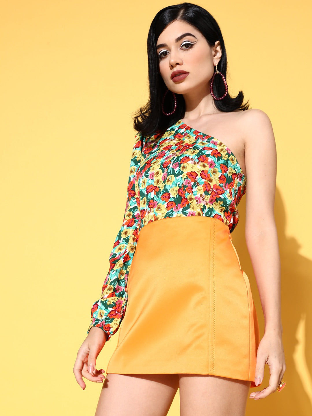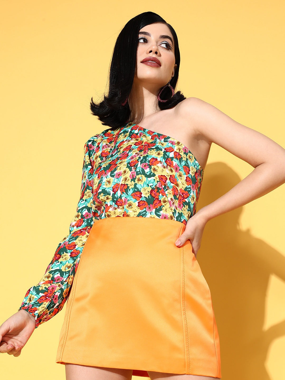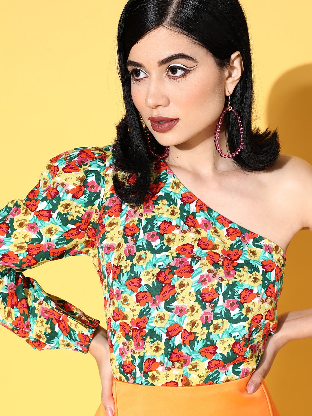 Berrylush Women Red, Green, & Yellow Floral Printed One-Shoulder Neck Crepe Woven Regular Top